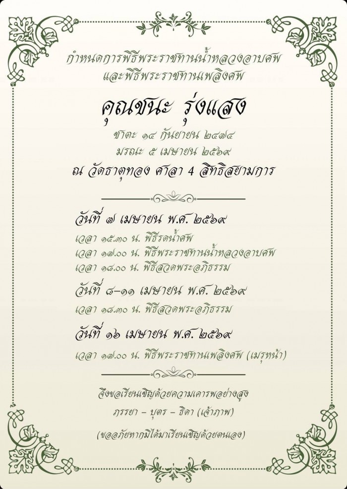 กำหนดการพิธีพระราชทานน้ำหลวงอาบศพและพิธีพระราชทานเพลิงศพ “คุณชนะ รุ่งแสง”