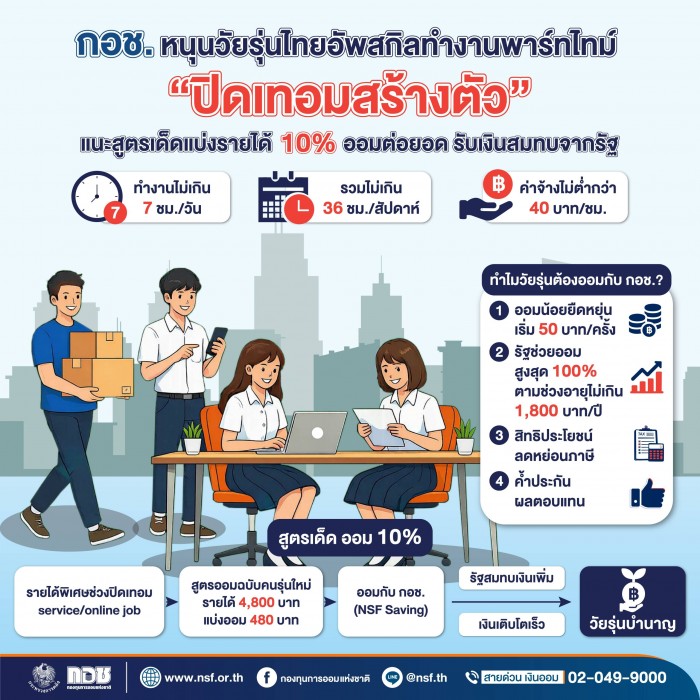 กอช. หนุนเด็กไทยอัพสกิลทำงานพาร์ทไทม์ “ปิดเทอมสร้างตัว” แนะสูตรเด็ดแบ่งรายได้ 10% ออมต่อยอดรับเงินสมทบจากรัฐ ปูทางสู่ “วัยรุ่นบำนาญ”