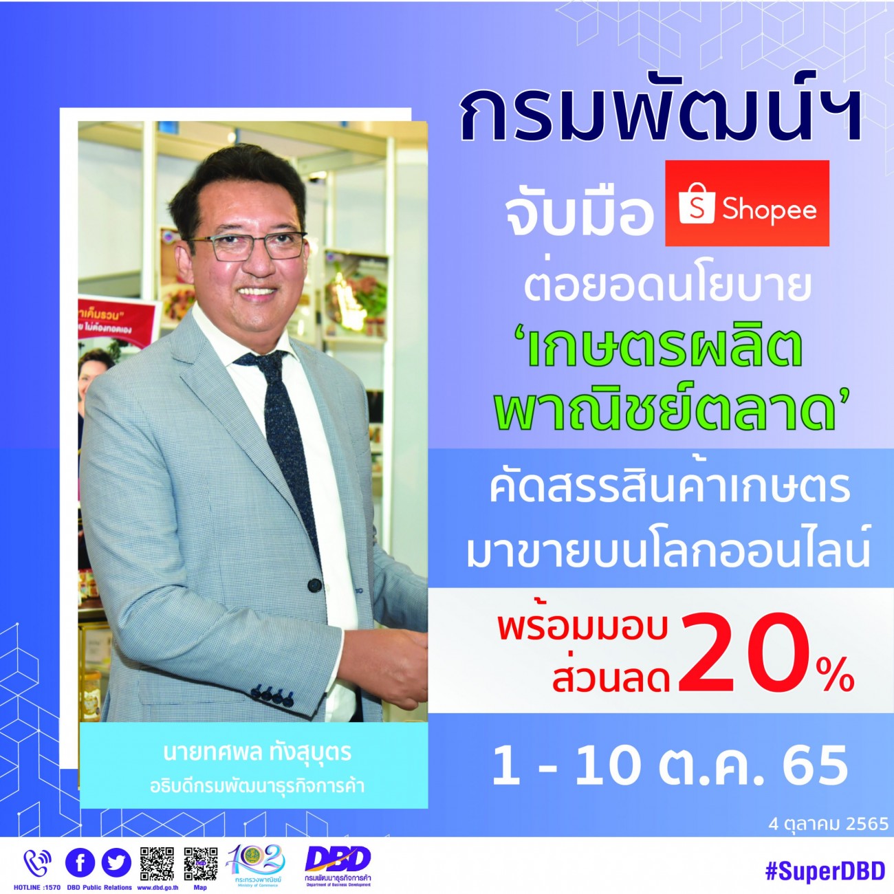 นายทศพล ทังสุบุตร อธิบดีกรมพัฒนาธุรกิจการค้า เปิดเผยว่าหลังจากที่กรมพัฒนาธุรกิจการค้าได้ดำเนินกิจกรรม “เกษตรคอมเมิร์ซ เปิดตัวบนโลกออนไลน์” ซึ่งเป็นกิจกรรมเจรจาจับคู่ธุรกิจระหว่างผู้ประกอบการสินค้าเกษตรที่ได้นำสินค้าขึ้นขายบนแพลตฟอร์ม B2B กับผู้ซื้อชั้นนำระดับประเทศไปเมื่อเดือนกันยายนที่ผ่านมา และเพื่อเป็นการเพิ่มโอกาสในการขยายตลาดไปยังกลุ่ม B2C กรมฯ จึงได้ร่วมกับแพลตฟอร์มออนไลน์ชื่อดังอย่าง Shopee รวบรวมสินค้าคุณภาพดีจากเกษตรกร กลุ่มสหกรณ์ และผู้ประกอบการขึ้นจำหน่ายภายใต้แคมเปญ ‘สุขใจซื้อของเกษตรไทย : เกษตรผลิต พาณิชย์ตลาด’ พร้อมแจกส่วนลดเพิ่มเติม 20% เพียงกรอก Code ‘DBD20’