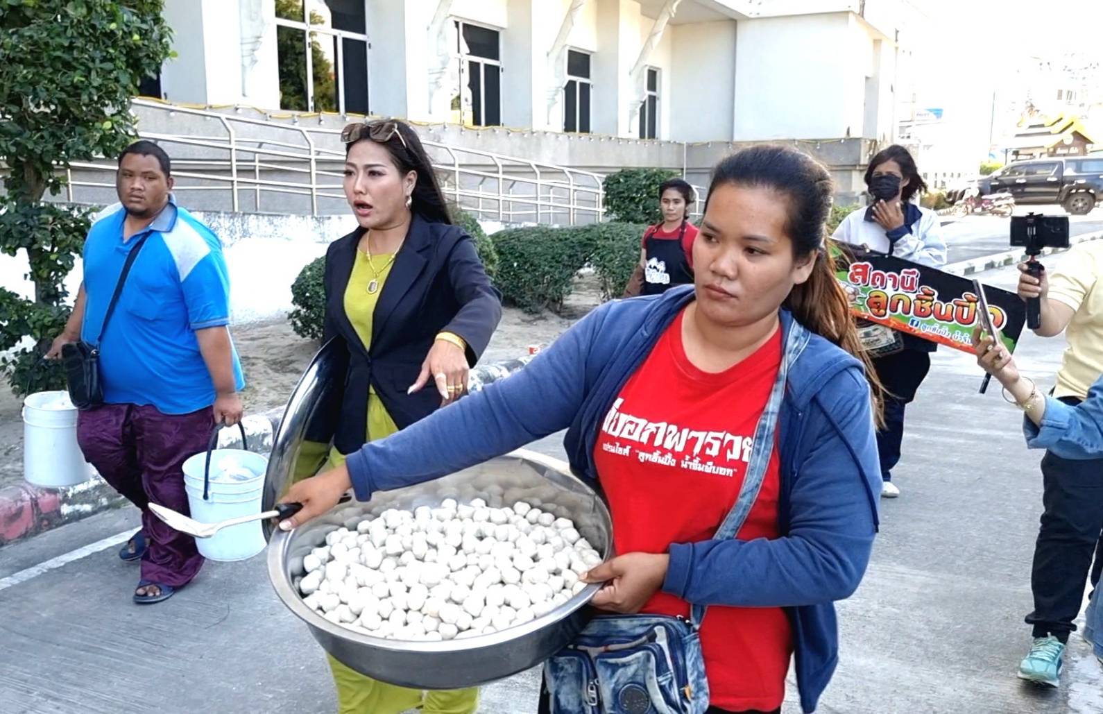 การเจราจาสร้างความไม่พอใจให้กับผู้เสียหาย จนนำลูกชิ้น และน้ำจิ้มมาเทที่หน้าศาลากลาง ท่ามกลางความสนใจของเจ้าหน้าที่ และผู้มาใช้บริการ