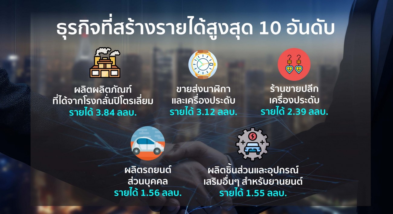 กรมพัฒนาธุรกิจการค้า เปิดรายได้ธุรกิจ 10 อันดับที่มีจำนวนสูงสุดจากการวิเคราะห์ข้อมูลผ่านงบการเงินประจำปี 2566 พบว่า มี 6 กลุ่มธุรกิจที่สามารถสร้างรายได้สูงสุดคือ กลุ่มผลิตผลิตภัณฑ์จากปิโตรเลียม กลุ่มเครื่องประดับ (ขายส่งนาฬิกาและเครื่องประดับและร้านขายปลีกเครื่องประดับ) กลุ่มยานยนต์ (ผลิตรถยนต์ส่วนบุคคล, ผลิตชิ้นส่วนและอุปกรณ์เสริมอื่นๆ และขายยานยนต์ใหม่ชนิดรถนั่งส่วนบุคคลฯ) ธุรกิจธนาคาร ธุรกิจอสังหาริมทรัพย์ และพลังงาน (ขายปลีกเชื้อเพลิงยานยนต์ในร้านเฉพาะสถานีบริการน้ำมันและขายส่งเชื้อเพลิงเหลว) ทั้ง 10 ธุรกิจยังคงครองอันดับเหมือนปี 2565 บางธุรกิจมีรายได้ที่เพิ่มขึ้นและลดลงเล็กน้อย โดยเฉพาะกลุ่มปิโตรเลียมและพลังงานที่มีปัจจัยพลังงานทางเลือกเข้ามาเป็นส่วนแบ่งทางการตลาด