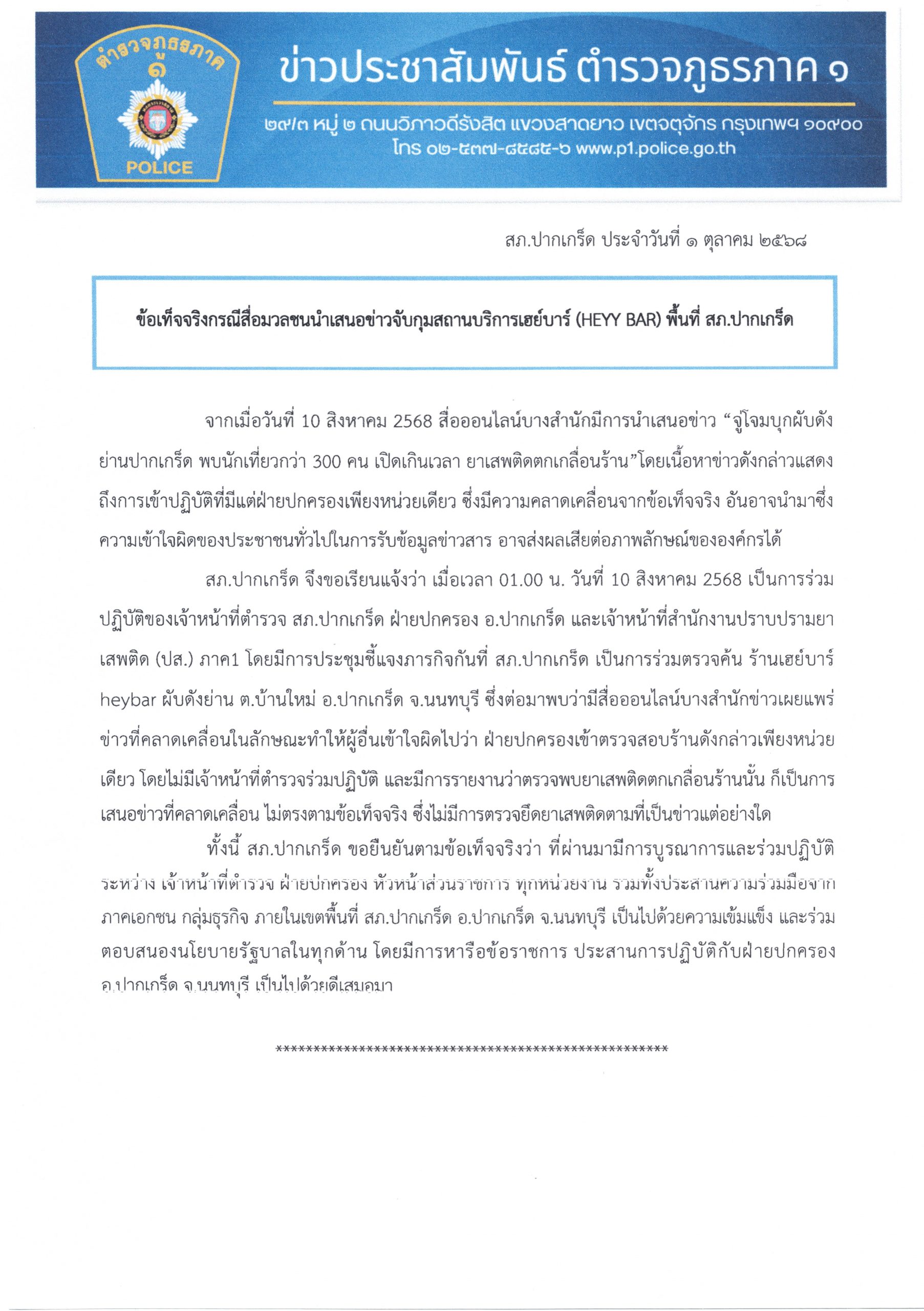 สภ.ปากเกร็ด จึงขอเรียนแจ้งว่า เมื่อเวลา 01.00 น. วันที่ 10 สิงหาคม 2568 เป็นการร่วมปฏิบัติของเจ้าหน้าที่ตำรวจ สภ.ปากเกร็ด ฝ่ายปกครอง อ.ปากเกร็ด และเจ้าหน้าที่สำนักงานปราบปรามยาเสพติด (ปส.) ภาค 1 โดยมีการประชุมชี้แจงภารกิจกันที่ สภ.ปากเกร็ด เป็นการร่วมตรวจค้น ร้านเฮย์บาร์ heybar ผับดังย่าน ต.บ้านใหม่ อ.ปากเกร็ด จ.นนทบุรี ซึ่งต่อมาพบว่ามีสื่อออนไลน์บางสำนักข่าวเผยแพร่ข่าวที่คลาดเคลื่อนในลักษณะทำให้ผู้อื่นเข้าใจผิดไปว่า ฝ่ายปกครองเข้าตรวจสอบร้านดังกล่าวเพียงหน่วยเดียว โดยไม่มีเจ้าหน้าที่ตำรวจร่วมปฏิบัติ และมีการรายงานว่าตรวจพบยาเสพติดตกเกลื่อนร้านนั้น ก็เป็นการเสนอข่าวที่คลาดเคลื่อน ไม่ตรงตามข้อเท็จจริง ซึ่งไม่มีการตรวจยึดยาเสพติดตามที่เป็นข่าวแต่อย่างใด