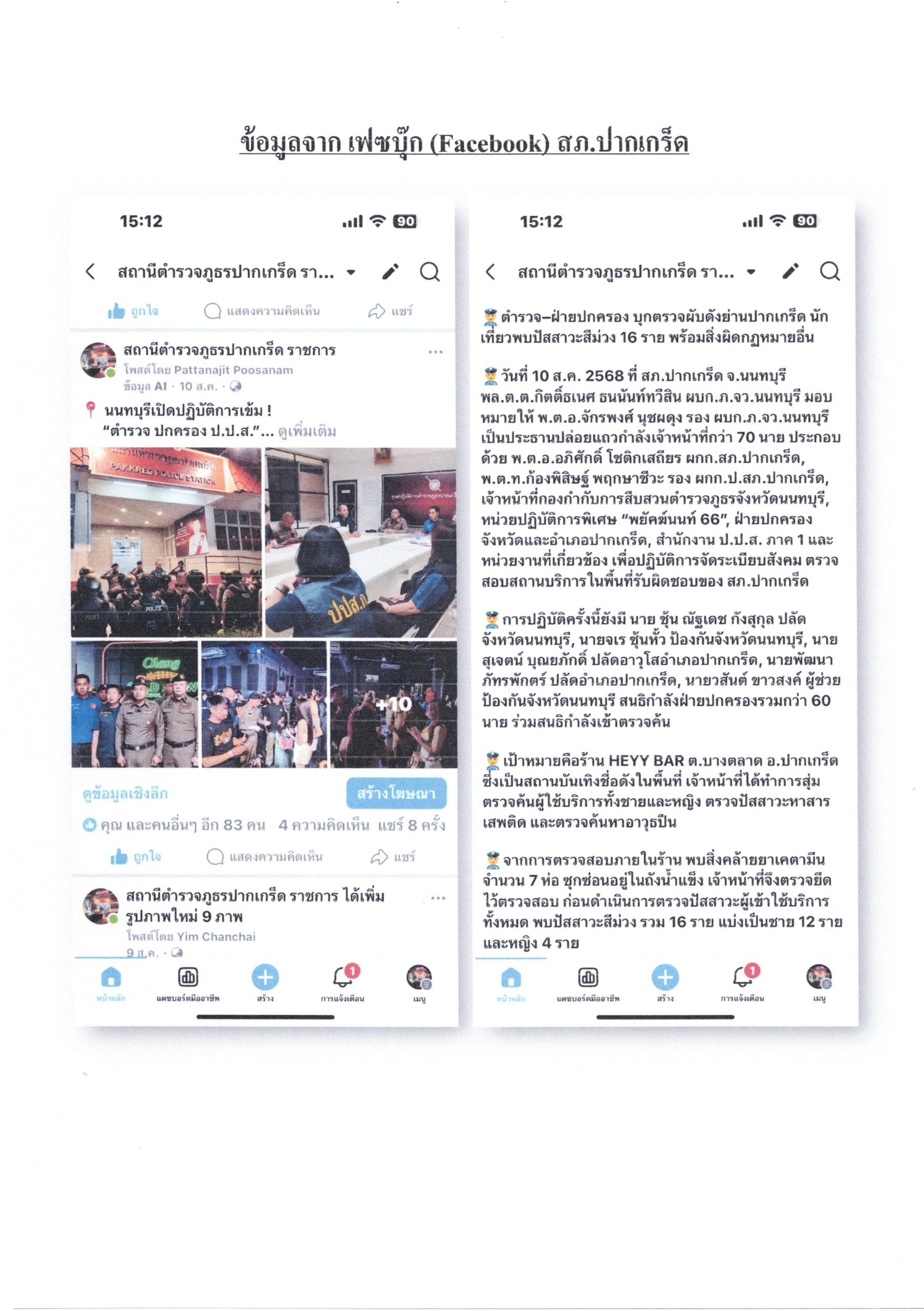 จากเมื่อวันที่ 10 สิงหาคม 2568 สื่อออนไลน์บางสำนักมีการนำเสนอข่าว “จู่โจมบุกผับดัง ย่านปากเกร็ด พบนักเที่ยวกว่า 300 คน เปิดเกินเวลา ยาเสพติดตกเกลื่อนร้าน” โดยเนื้อหาข่าวดังกล่าวแสดง ถึงการเข้าปฏิบัติที่มีแต่ฝ่ายปกครองเพียงหน่วยเดียว ซึ่งมีความคลาดเคลื่อนจากข้อเท็จจริง อันอาจนำมาซึ่งความเข้าใจผิดของประชาชนทั่วไปในการรับข้อมูลข่าวสาร อาจส่งผลเสียต่อภาพลักษณ์ขององค์กรได้