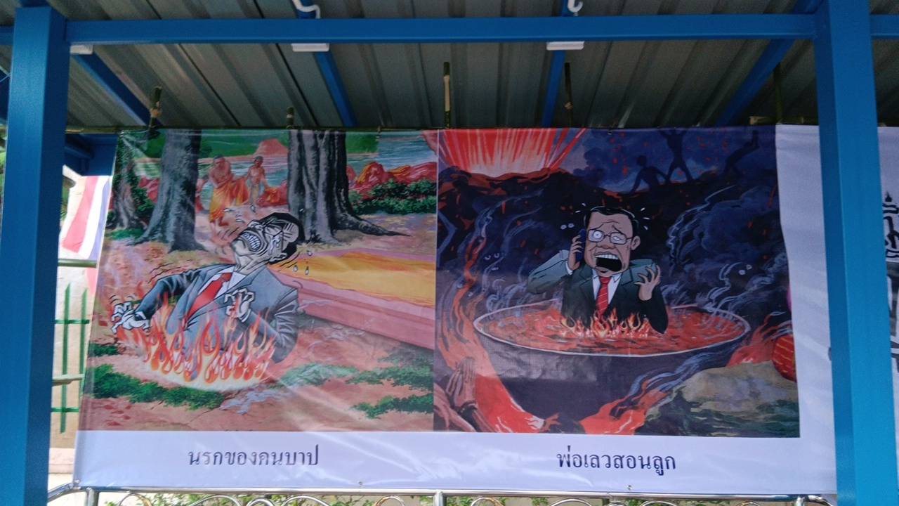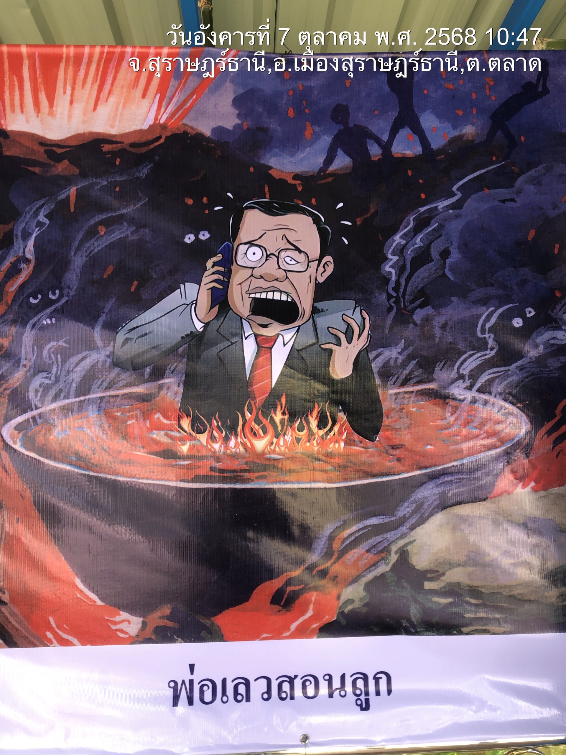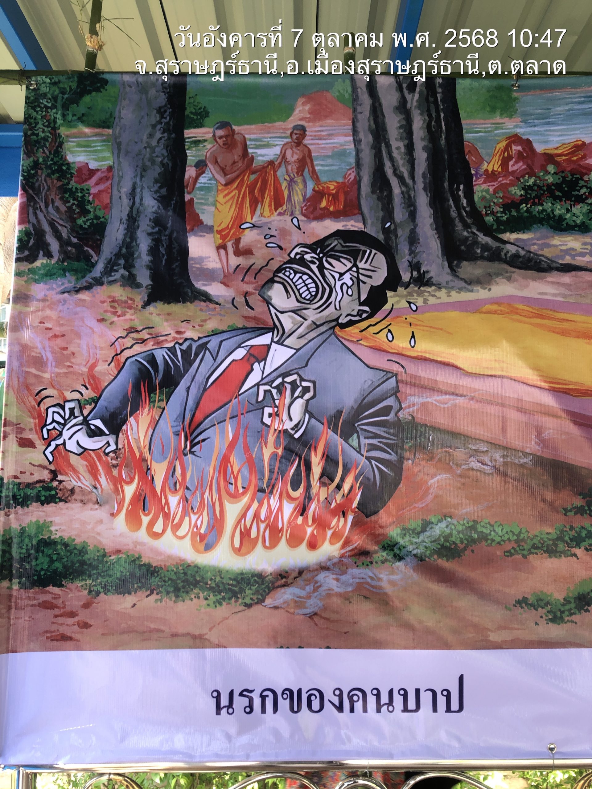 ส่วนภาคนรก เป็นภาพการ์ตูนล้อเลียนบุคคลที่มีใบหน้า “คล้ายสมเด็จฮุนเซน” กำลังถูก “ธรณีสูบ” มีข้อความข้างล่างว่า “นรกของคนบาป” และภาพฮุนเซนใส่สูที่ “ตกนรกกระทะทองแดง” ในมือยังถือโทรศัพท์มือถือ ด้านล่างเขียนข้อความว่า “พ่อเลวสอนลูก” สะท้อนภาพกฎแห่งกรรมจากสงครามไทย-เขมรที่ฮุนเซ็นเป็นผู้ก่อไฟสงครามว่าเมื่อตายไปต้องตกนรกตามความเชื่อของชาวพุทธ เมื่อประชาชนได้เห็นภาพ “ฮุนเซ็นตกนรก” ก็เป็นที่ฮือฮาอย่างมากในงานชักพระสุราษฎร์ธานีประจำปีนี้.