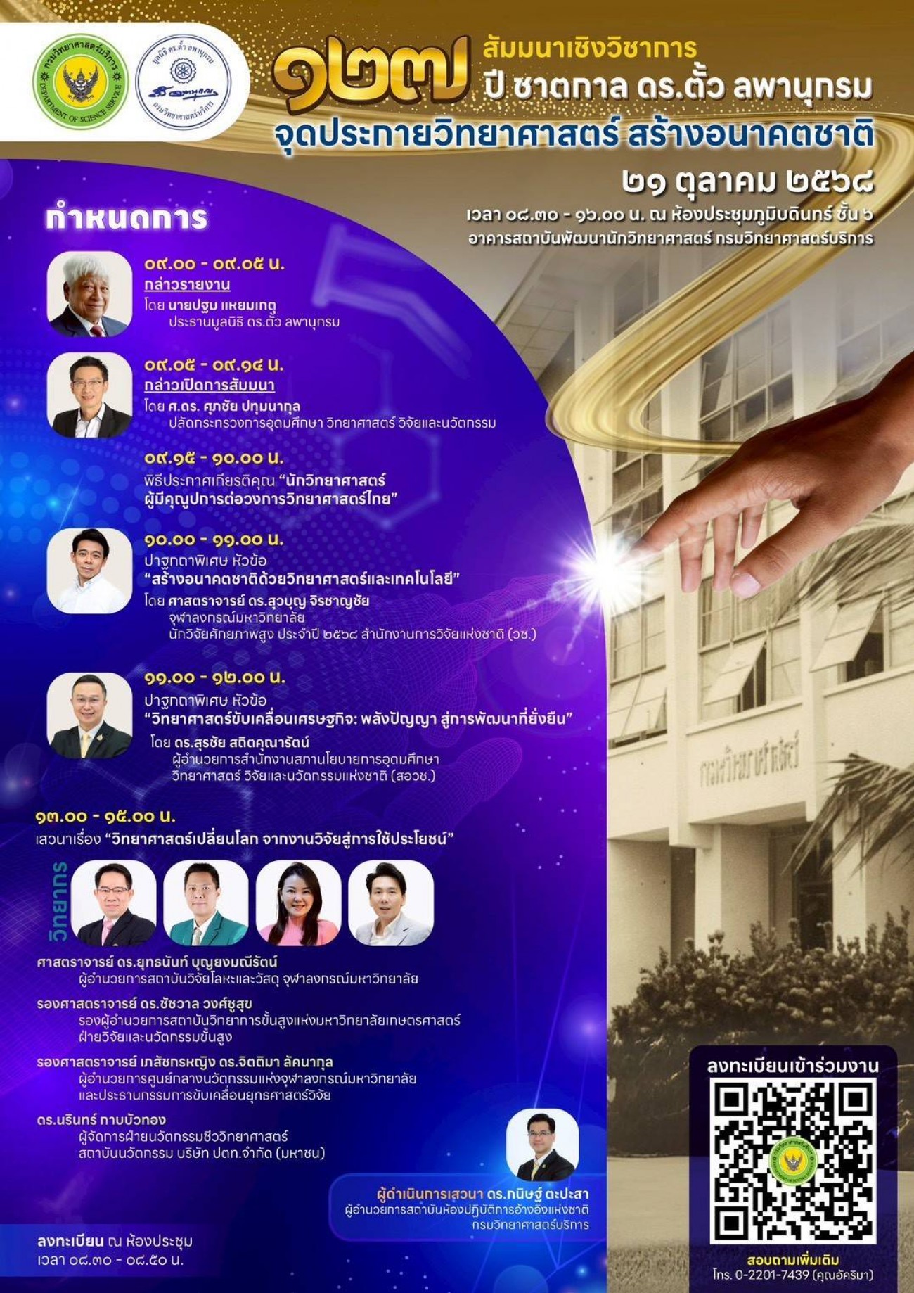 (วศ.อว.) จึงขอเชิญชวนทุกท่านที่สนใจและให้ความสำคัญในงานด้านวิทยาศาสตร์ มาร่วมเป็นส่วนหนึ่งในการสืบสานเจตนารมณ์ของ ดร.ตั้ว ลพานุกรม รัฐบุรุษผู้บุกเบิกงานวิทยาศาสตร์ของไทย พร้อมปาฐกกถาพิเศษและเสวนาแลกเปลี่ยนองค์ความรู้จากนักวิจัยชั้นนำของประเทศ อาทิ ศาสตราจารย์ ดร.สุวบุญ จิรชาญชัย จากจุฬาลงกรณ์มหาวิทยาลัย รางวัลนักวิจัยคุณภาพสูง ประจำปี 2568 ของสำนักงานการวิจัยแห่งชาติ (วช.) ดร.สุรชัย สถิตคุณารัตน์ ผู้อำนวยการสำนักงานสภานโยบายการอุดมศึกษา วิทยาศาสตร์ วิจัยและนวัตกรรม (สอวช.) และวิทยากรผู้ทรงคุณวุฒิอีกมากมาย และภายในงานจะมีพิธีประกาศเกียรติคุณ “นักวิทยาศาสตร์ผู้มีคุณูปการต่อวงการวิทยาศาสตร์ไทย” โดยได้รับเกียรติจากศาสตราจารย์ ดร.ศุภชัย ปทุมนากุล ปลัดกระทรวง (อว.) เป็นประธาน ณ ห้องประชุมภูมิบดินทร์ ชั้น 6 อาคารสถาบันพัฒนานักวิทยาศาสตร์ กรมวิทยาศาสตร์บริการ