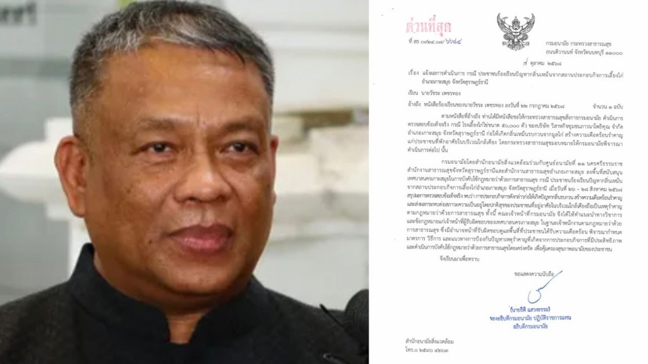 วันที่ 12 ตุลาคม 2568 นายวัชระ เพชรทอง อดีต สส.พรรคประชาธิปัตย์ กล่าวว่าได้รับหนังสือจากกรมอนามัย กระทรวงสาธารณสุข ด่วนที่สุด ที่ สธ 0924.07/6684 ลงวันที่ 7 ต.ค. 68 แจ้งผลการดำเนินการ กรณี ประชาชนร้องเรียนปัญหากลิ่นเหม็นจากสถานประกอบกิจการเลี้ยงไก่ ความว่า
