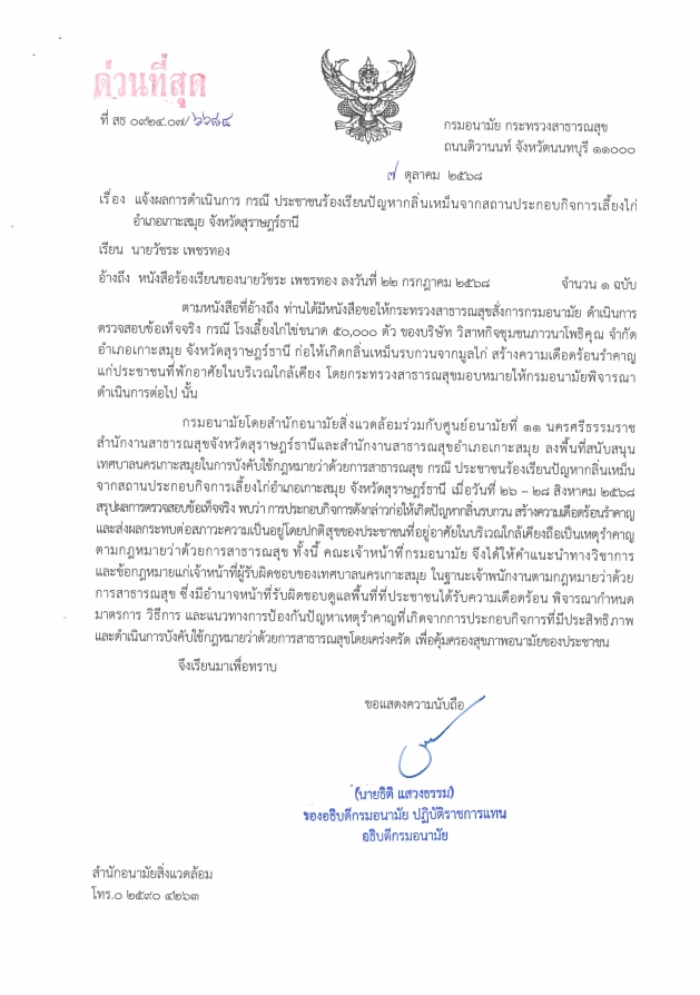 กรมอนามัยโดยสำนักอนามัยสิ่งแวดล้อมร่วมกับศูนย์อนามัยที่ 11 นครศรีธรรมราช สำนักงานสาธารณสุขจังหวัดสุราษฎร์ธานีและสำนักงานสาธารณสุขอำเภอเกาะสมุย ลงพื้นที่สนับสนุนเทศบาลนครเกาะสมุยในการบังคับใช้กฎหมายว่าด้วยการสาธารณสุข กรณี ประชาชนร้องเรียนปัญหากลิ่นเหม็นจากสถานประกอบกิจการเลี้ยงไก่อำเภอเกาะสมุย จังหวัดสุราษฎร์ธานี เมื่อวันที่ 26-28 สิงหาคม 2568 สรุปผลการตรวจสอบข้อเท็จจริง พบว่า การประกอบกิจการดังกล่าวก่อให้เกิดปัญหากลิ่นรบกวน สร้างความเดือดร้อนรำคาญ และส่งผลกระทบต่อสภาวะความเป็นอยู่โดยปกติสุขของประชาชนที่อยู่อาศัยในบริเวณใกล้เคียงถือเป็นเหตุรำคาญตามกฎหมายว่าด้วยการสาธารณสุข ทั้งนี้ คณะเจ้าหน้าที่กรมอนามัย จึงได้ให้คำแนะนำทางวิชาการและข้อกฎหมายแก่เจ้าหน้าที่ผู้รับผิดชอบของเทศบาลนครเกาะสมุย ในฐานะเจ้าพนักงานตามกฎหมายว่าด้วยการสาธารณสุข ซึ่งมีอำนาจหน้าที่รับผิดชอบดูแลพื้นที่ที่ประชาชนได้รับความเดือดร้อน พิจารณากำหนดมาตรการ วิธีการ และแนวทางการป้องกันปัญหาเหตุรำคาญที่เกิดจากการประกอบกิจการที่มีประสิทธิภาพและดำเนินการบังคับใช้กฎหมายว่าด้วยการสาธารณสุขโดยเคร่งครัด เพื่อคุ้มครองสุขภาพอนามัยของประชาชน