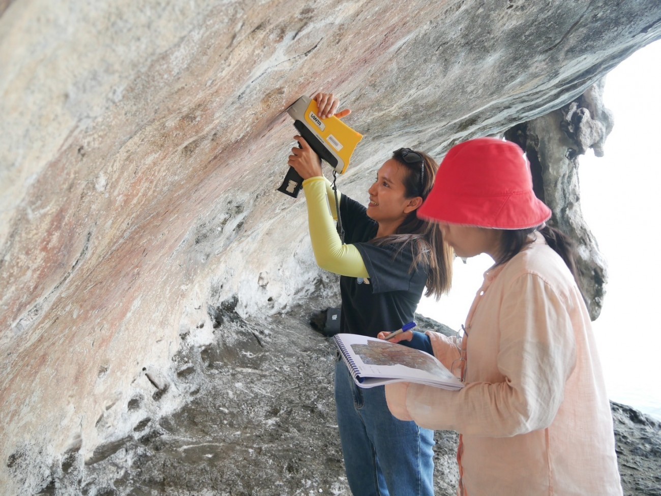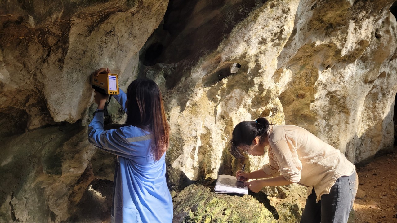 “คณะวิจัยจากทั้งสองหน่วยงานได้ลงพื้นที่ เพื่อหาข้อมูลเบื้องต้นเกี่ยวกับธาตุองค์ประกอบในสีที่มนุษย์โบราณใช้สร้างสรรค์ภาพวาด อันจะนำไปสู่การระบุแหล่งที่มาของวัตถุดิบที่นำมาใช้ในการผลิตสี รวมถึงสามารถใช้ข้อมูลดังกล่าวในการวิเคราะห์บริบททางวัฒนธรรมและสังคมของมนุษย์ยุคก่อนประวัติศาสตร์ได้อย่างมีประสิทธิภาพมากยิ่งขึ้น โดยในการศึกษาครั้งนี้ ทีมวิจัยได้นำเครื่องวิเคราะห์ธาตุแบบพกพาไปใช้ในการวิเคราะห์องค์ประกอบทางเคมีของสีที่ปรากฏบนผนังถ้ำ”