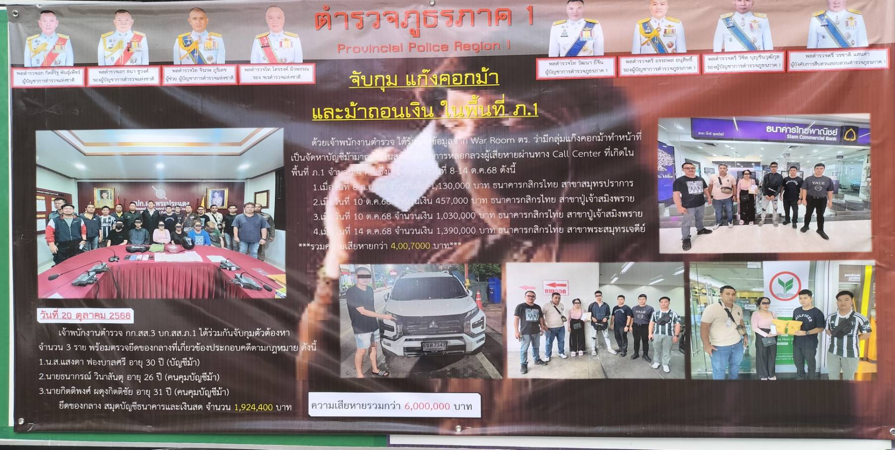 โดยเจ้าหน้าที่ตำรวจ กก.สส.3 บก.สส.ภ.1 ได้สืบสวนติดตามจนรู้ตัวกลุ่มคนร้ายและยานพาหนะที่ใช้ก่อเหตุทั้งหมดว่าเป็นกลุ่มเดียวกัน ที่ทำหน้าที่เป็นกลุ่มคนคุมคอกบัญชีม้าในพื้นที่ จ.สมุทรปราการ จนกระทั่งในวันที่ 20 ต.ค.2568 เวลาประมาณ 15.30 น. เจ้าหน้าที่ตำรวจสืบสวนทราบว่า กลุ่มคนร้ายที่คุมคอกบัญชีม้าได้ออกมาเตรียมตัวเพื่อจะให้บัญชีม้าออกมาถอนเงินสด จึงได้สะกดรอยติดตามไปจนถึงห้างสรรพสินค้าแห่งหนึ่ง สาขาพระประแดง และเฝ้าติดตามไว้ จนกระทั่งมี น.ส.แสงดาฯ พร้อมกับนายธนากรณ์ฯ ลงมาจากรถยนต์ ยี่ห้อ mitsubishi รุ่น xpender ที่ใช้รับส่งบัญชีม้าไปถอนเงินตามสถานที่ต่างๆ ได้เดินไปถอนเงินสดที่ธนาคารแรก จำนวน 525,820 บาท และธนาคารที่สอง จำนวน 1,398,580 บาท (ถูกหักค่าธรรมเนียมบัญชีต่างจังหวัด 1,420 บาท) รวมทั้ง 2 ธนาคารเป็นเงิน จำนวน 1,924,400 บาท ต่อมา น.ส.แสงดาฯ ได้นำเอาเงินไปให้นายธนากรณ์ฯ ที่ยืนรออยู่บริเวณใกล้กับธนาคารฯ เพื่อจะนำเงินสดไปให้ นายกิตติพงศ์ฯ ที่จอดรถยนต์รออยู่ในบริเวณลานจอดรถของห้างฯ เพื่อรอนำไปส่งให้แก่คนรวมเงินไปส่งให้ผู้สั่งการ