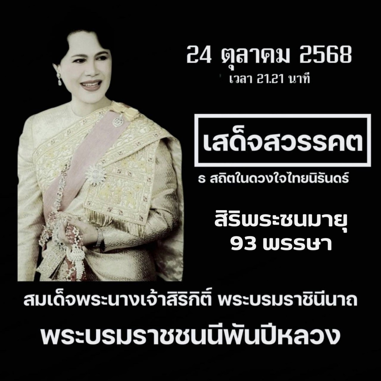 ตั้งแต่วันที่ 17 ตุลาคม พุทธศักราช 2568 สมเด็จพระนางเจ้าสิริกิติ์ พระบรมราชินีนาถพระบรมราชชนนีพันปีหลวง ทรงพระประชวรจากภาวะติดเชื้อในกระแสพระโลหิต แม้ว่าคณะแพทย์จะถวายการรักษาอย่างสุดความสามารถแล้ว แต่พระอาการทรุดหนักลงตามลำดับ ถึงวันศุกร์ ที่ 24 ตุลาคม พุทธศักราช 2568 เวลา 21 นาฬิกา 21 นาที เสด็จสวรรคต ณ โรงพยาบาลจุฬาลงกรณ์ สภากาชาดไทย ด้วยพระอาการสงบ สิริพระชนมพรรษาปีที่ 93
