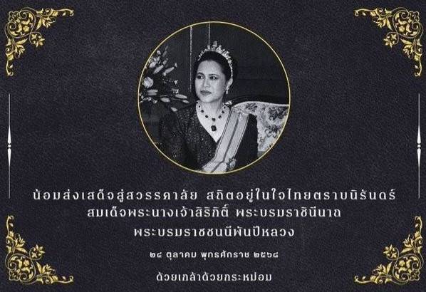 “พระแม่ของแผ่นดิน สมเด็จพระนางเจ้าสิริกิติ์ พระบรมราชินีนาถ พระบรมราชชนนีพันปีหลวง ได้เสด็จสวรรคต สู่สรวงสวรรค์ชั้นฟ้า ประชาชนชาวไทย ใต้ร่มพระบารมี ต่างเศร้าโศก อาลัยสุดพรรณา รอยยิ้มความเมตตา พระจริยวัตรงดงาม สิริโฉมทั่วโลกกล่าวขานถึง ยังตราตรึง ในหัวใจประชาชนชาวไทย ไม่รู้ลืม”