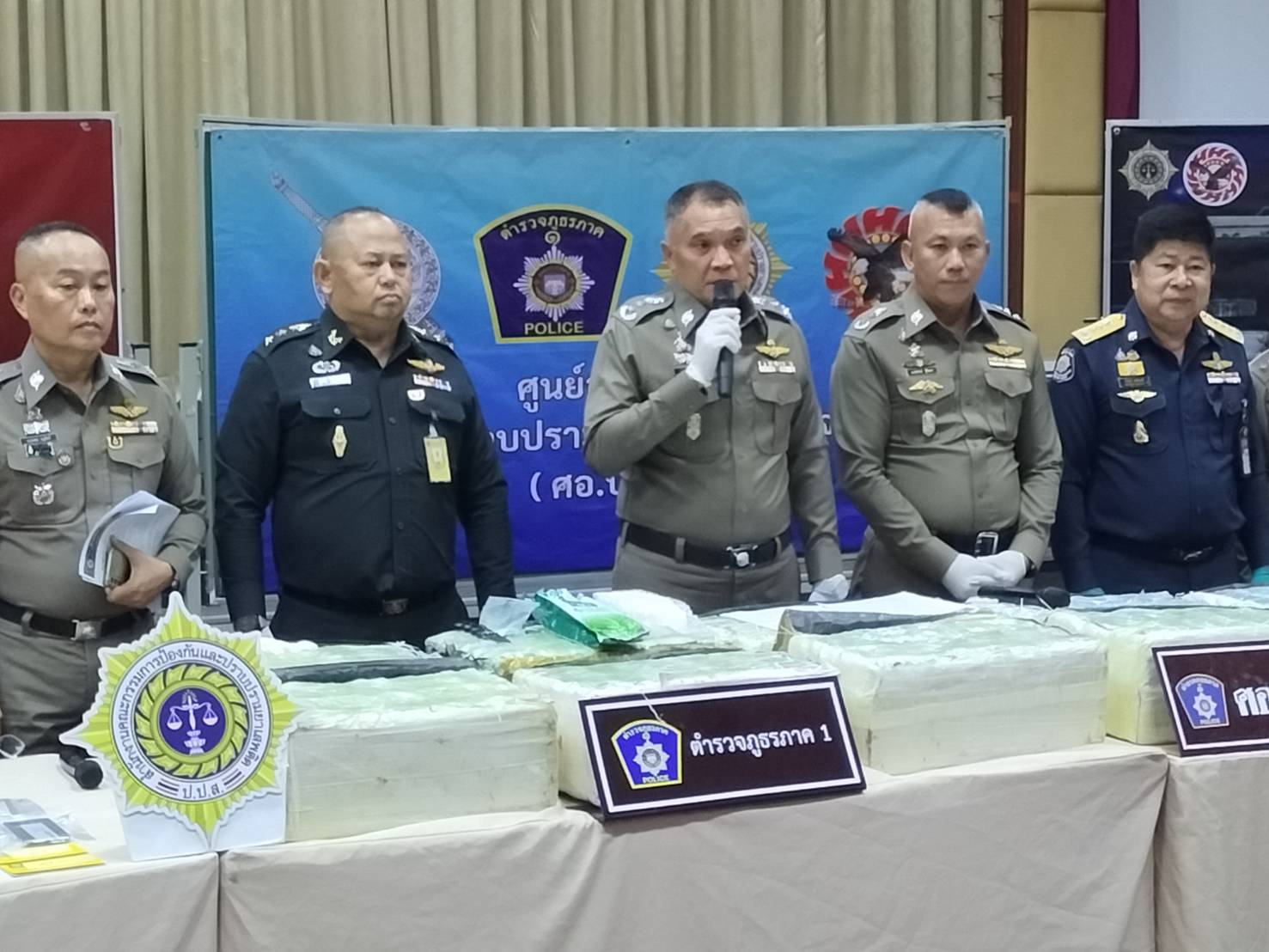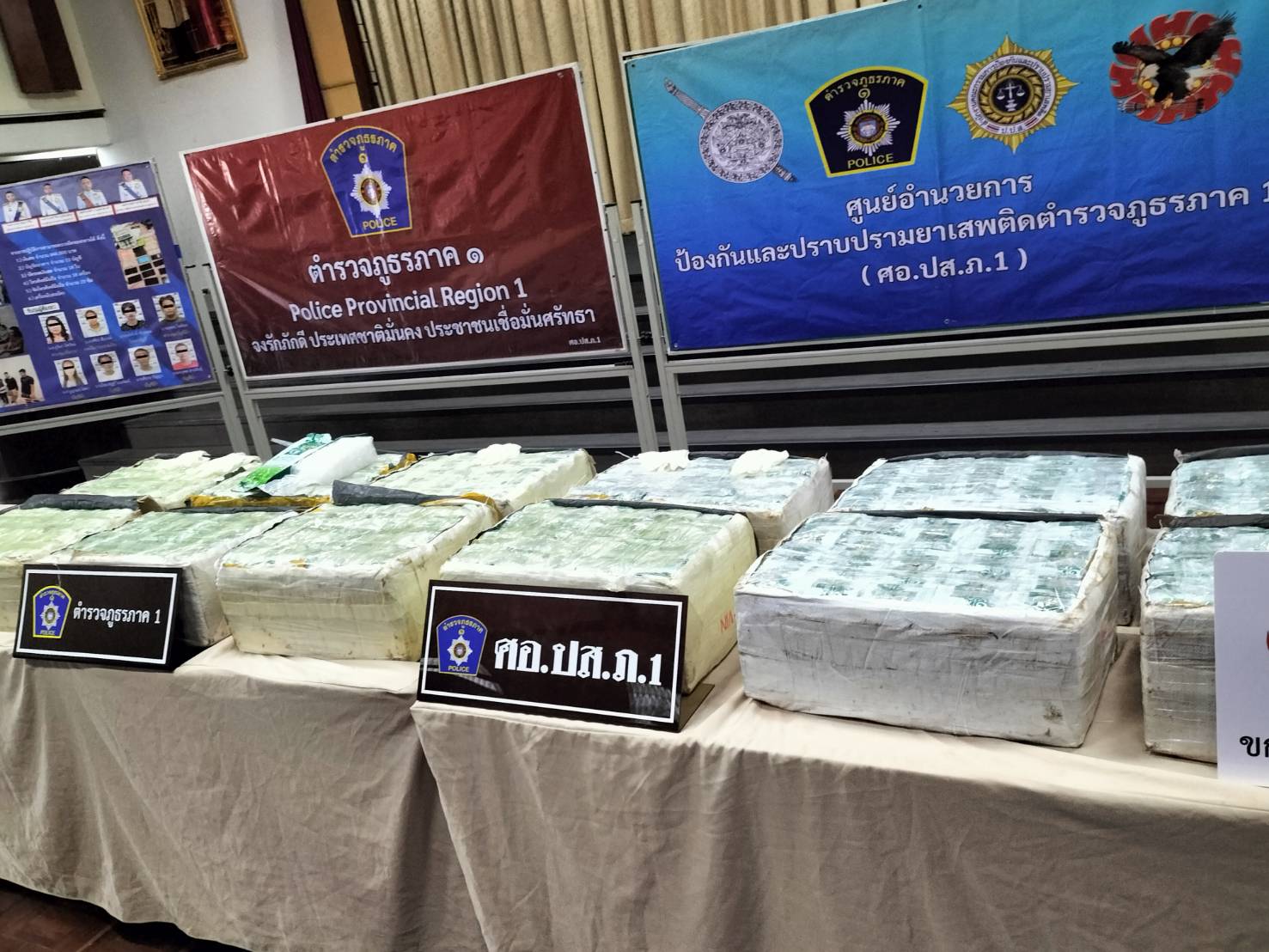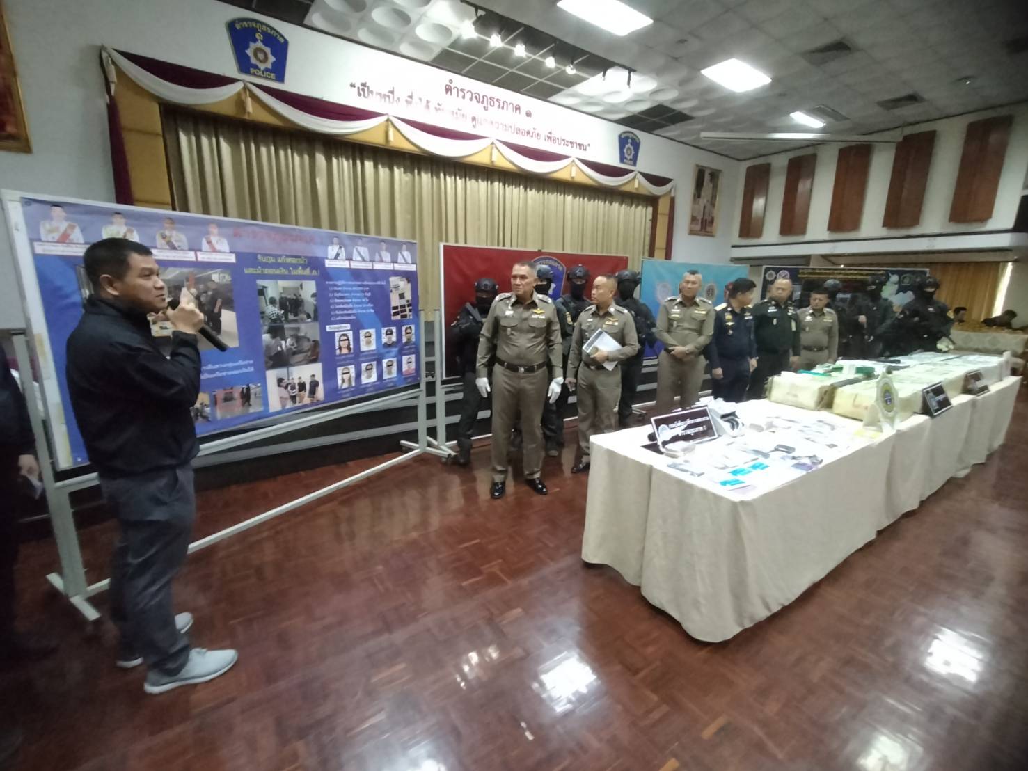 ตำรวจภูธรภาค 1 แถลงข่าวการจับกุมยาคีตามีนน้ำหนัก 300 กิโลกรัม และปฏิบัติการล้มคอกม้ายึดเงินสดได้คามือ 846,800 บาท
