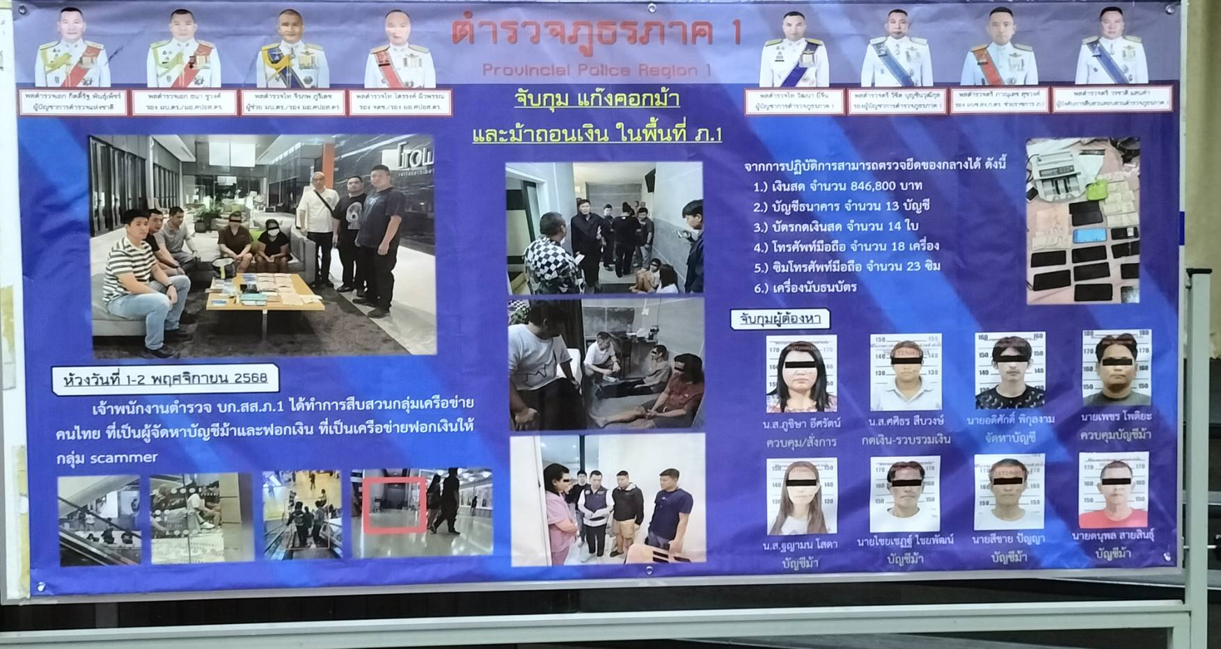 บก.สส.ภ.1 ยึดเงินสดได้คามือ 846,800 บาท ระหว่างวันที่ 1-2 พฤศจิกายน 2568 ชุด บก.สส.ภ.1 ได้ทำการสืบสวนกลุ่มเครือข่ายคนไทยที่เป็นผู้จัดหาบัญชีม้าและฟอกเงิน ที่เป็นเครือข่ายฟอกเงินให้กลุ่ม scamnner โดยได้ทำการสืบสวนจนจนทราบว่ามีกลุ่มบุคคลมีพฤติกรรมรวมตัวกันเป็นกลุ่ม จัดหาบัญชีม้าเพื่อรับเงินจากกลุ่มแก๊งอาชญากรรมคอลเซ็นเตอร์ระหว่างประเทศ โดยมีหัวหน้าชาวจีนคอยสั่งการหญิงชาวไทยให้รวบรวมจัดหากลุ่มบุคคลที่จะรับโอนเงินจากการหลอกลวง นำเงินดังกล่าวมาฟอกด้วยวิธีการนำเงินสดไปและเปลี่ยนเป็นเป็นเงินสกุลคริปโตเคอเรนชื่ แล้วส่งต่อกลับคืนไปให้หัวหน้าชายชาวจีน โดยกลุ่มคอกม้าจะได้เงินเป็นเปอร์เซ็นของการกดเงินได้เป็นค่าตอบแทน จึงได้ทำการสืบสวนเรื่อยมาจนกระทั่งทั่งนำไปสู่การสะกดรอย เฝ้าสังเกตการณ์ และนำไปสู่การตรวจค้นจับกุมผู้ต้องหาและตรวจยึดของกลาง ในสถานที่ต่างๆ ดังนี้