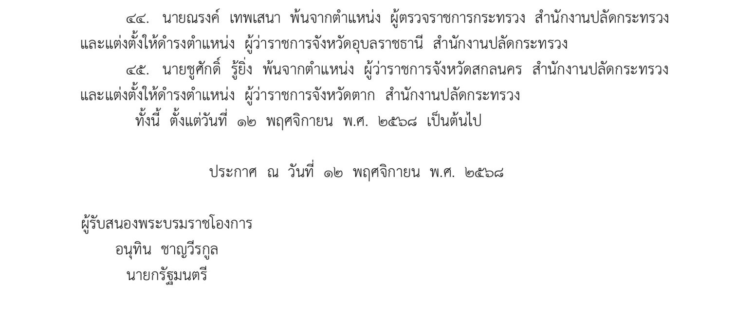 เว็บไซต์ราชกิจจานุเบกษา เผยแพร่ประกาศสำนักนายกรัฐมนตรี เรื่อง แต่งตั้งข้าราชการพลเรือนสามัญ ตำแหน่งประเภทบริหารระดับสูง ในสังกัดกระทรวงมหาดไทย จำนวน 45 ราย ตั้งแต่วันที่ 12 พฤศจิกายน 2568 เป็นต้นไป
