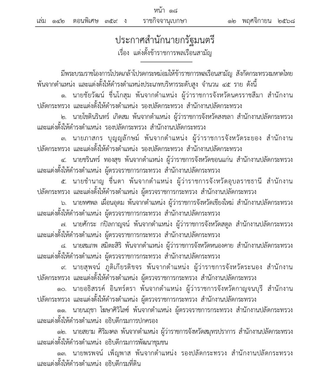 เว็บไซต์ราชกิจจานุเบกษา เผยแพร่ประกาศสำนักนายกรัฐมนตรี เรื่อง แต่งตั้งข้าราชการพลเรือนสามัญ ตำแหน่งประเภทบริหารระดับสูง ในสังกัดกระทรวงมหาดไทย จำนวน 45 ราย ตั้งแต่วันที่ 12 พฤศจิกายน 2568 เป็นต้นไป