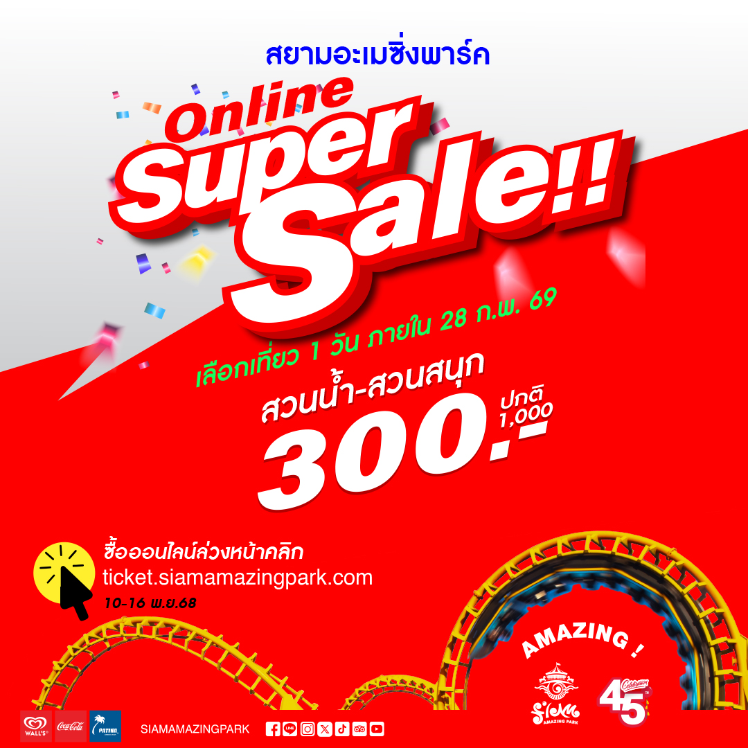 สยามอะเมซิ่งพาร์ค จัดหนักจัดเต็ม โปรโมชั่นพิเศษ Super Sale ในโอกาสครบ 45 ปี เที่ยวได้ทั้งสวนสนุก เครื่องเล่นระดับโลกมากมาย สวนน้ำสุดอลังการ พร้อมเปิดตัวเครื่องเล่นใหม่กลางทะเล-กรุงเทพฯ Ranger’s Pirate Lagoon สนุกไม่อั้นไม่จำกัดรอบทั้งวัน บัตรผู้ใหญ่ (130 ซม. ขึ้นไป) ในราคาพิเศษเพียง 300 บาท (จากปกติ 1,000 บาท) เลือกเที่ยววันใดก็ได้ภายใน 28 ก.พ. 69 ช่องทางเดียวง่ายๆ ซื้อออนไลน์ที่ http://ticket.siamamazingpark.com วันนี้ถึง 16 พ.ย. เท่านั้น