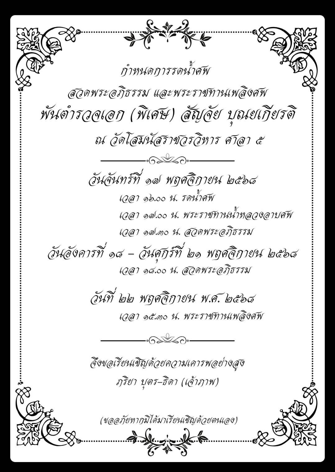 ทางเจ้าภาพจัดพิธีพระราชทานน้ำหลวงอาบศพ วัดโสมมนัส ศาลา 5 ในวันจันท์ที่ 17 พ.ย.2568 เวลา 17.00 น. ส่วนหมายกำหนดการสวดพระอภิธรรม ญาติ ๆ แจ้งให้ทราบตามนี้