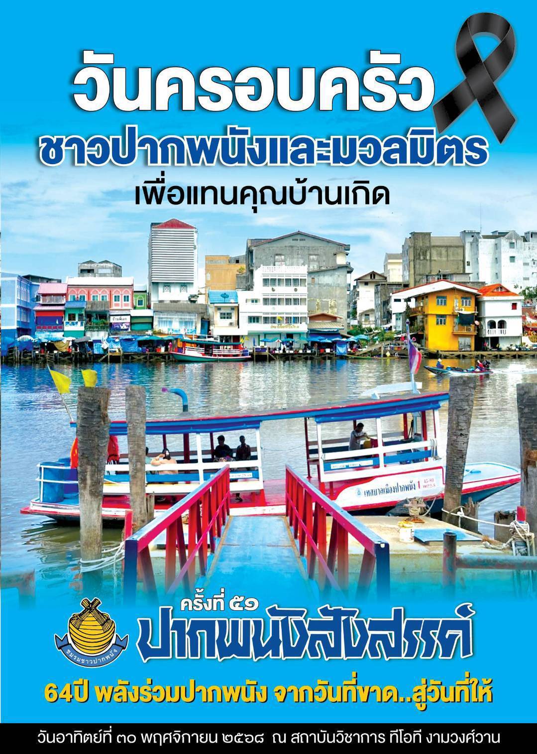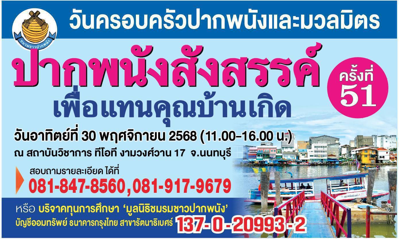 มูลนิธิชมรมชาวปากพนัง จัดงานวันครอบครัวชาวปากพนังและมวลมิตร “ปากพนังสังสรรค์” ครั้งที่ 51 ประจำปี2568 เพื่อระดมทุนการศึกษาให้กับนักเรียน ในวันอาทิตย์ที่ 30 พฤศจิกายน 2568 ที่สถาบันวิชาการทีโอที งามวงศ์วาน 17 นนทบุรี เวลา 11.00-16.00 น.