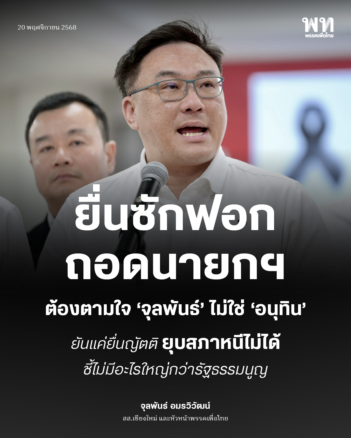 ‘เพื่อไทย’ ยื่นซักฟอกถอดนายกฯ ต้องตามใจ ‘จุลพันธ์’ ไม่ใช่ ‘อนุทิน’ ยันแค่ยื่นญัตติก็ยุบสภาหนีไม่ได้ ชี้ไม่มีอะไรใหญ่กว่ารัฐธรรมนูญ