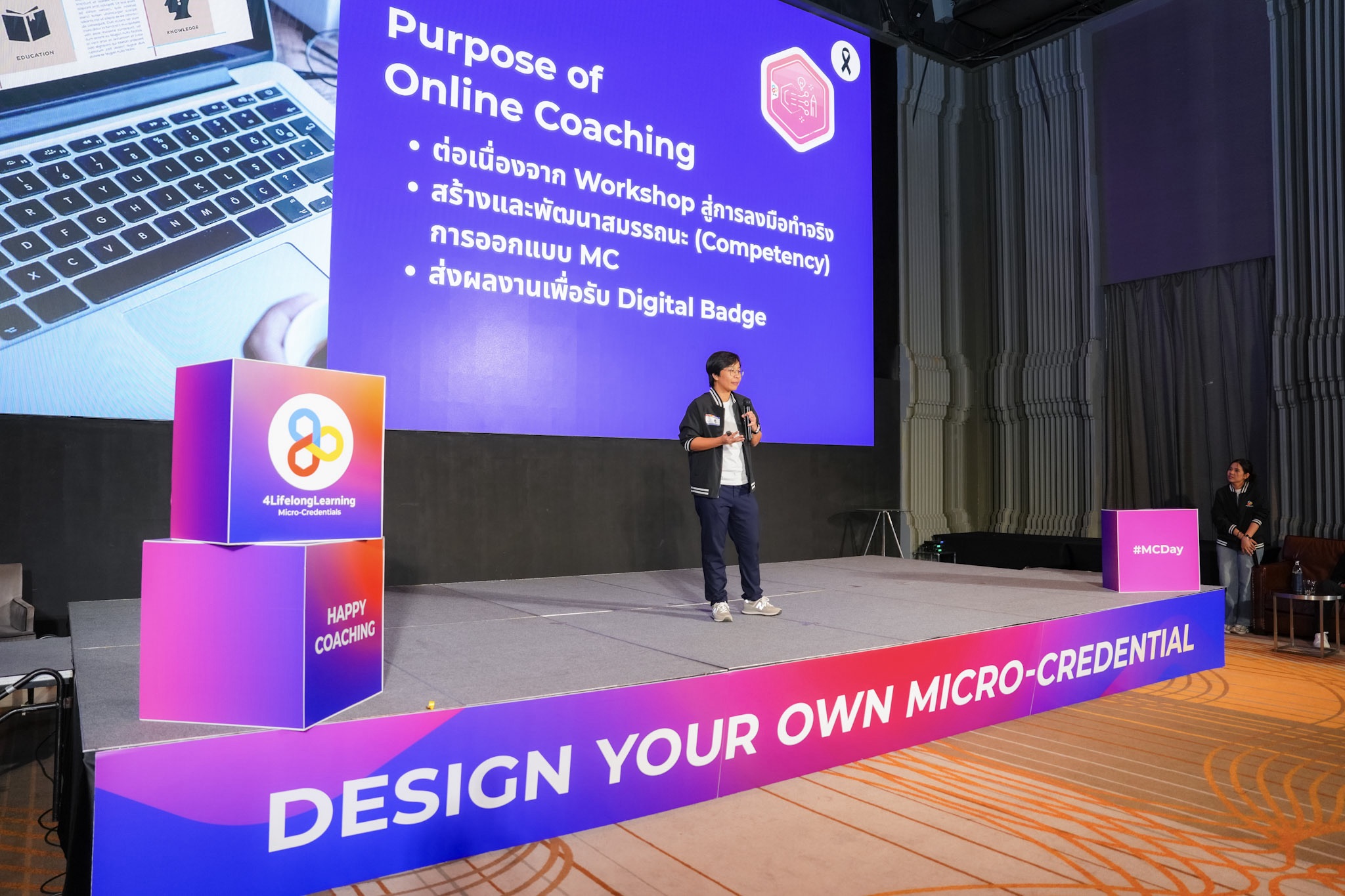 พร้อมปิดท้ายโดย ดร.อรชุน อุดมเกษมทรัพย์ ได้ให้คำแนะนำการทำงานของ 4LifelongLearning แพลตฟอร์มที่ให้บริการพัฒนาทักษะและพิสูจน์ความสามารถ รวมถึงเผยแพร่ Micro-Credential (MC) พร้อมบริการสนับสนุนอาจารย์ทั่วประเทศให้พัฒนา Micro-Credential (MC) ได้สำเร็จ ขณะที่ ดร.สุภาพร แป้นสุวรรณ์ Designer Support Team Leader กล่าวถึงแนวทางการฝึกฝนและแผนการโค้ชชิ่งออนไลน์ต่อเนื่อง 3 เดือน กับทีม 4LifelongLearning เพื่อพัฒนาหลักสูตร Micro-Credential (MC) ในสาขาวิชาและความเชี่ยวชาญของตนเอง และนำไปต่อยอดกับมหาวิทยาลัยของตนเองที่สังกัด