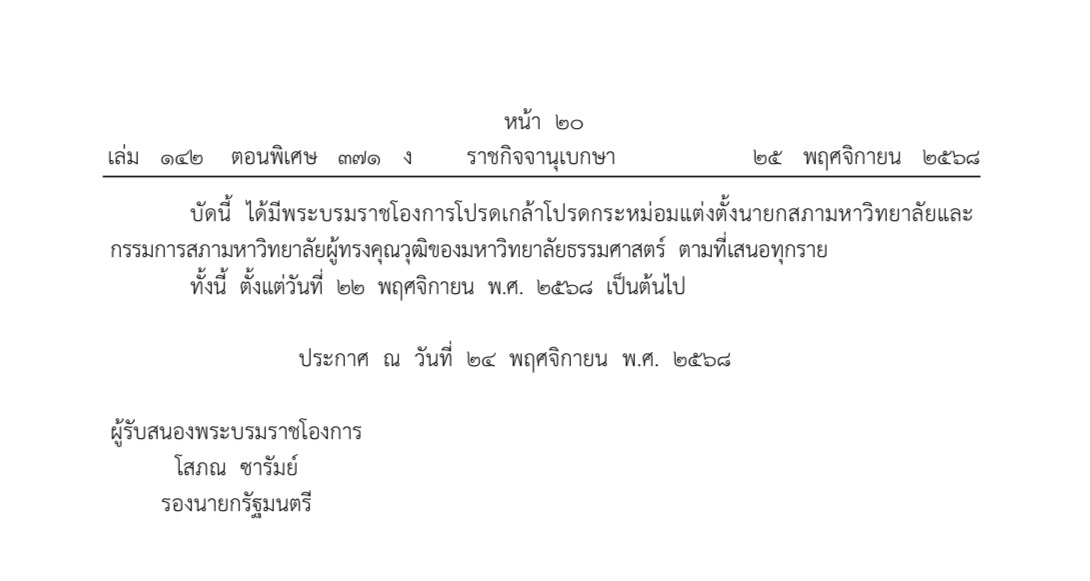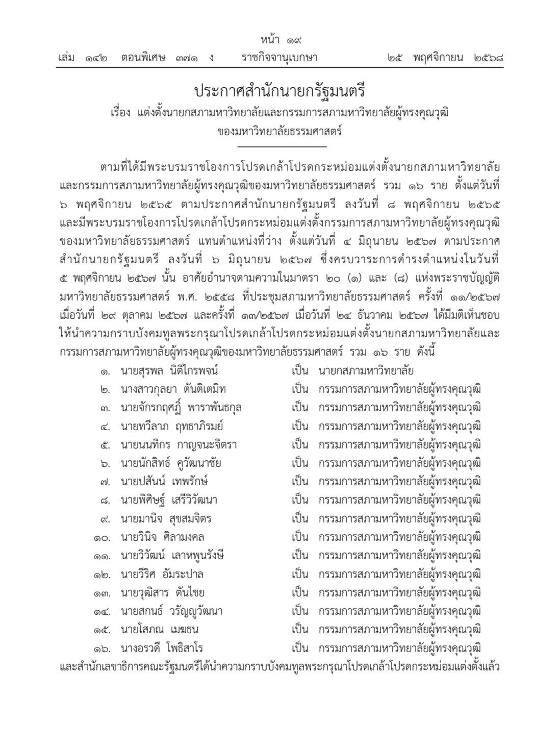 ๒๕ พฤศจิกายน ๒๕๖๘ เว็บไซต์ราชกิจจานุเบกษา เผยแพร่ ประกาศสำนักนายกรัฐมนตรี เรื่อง แต่งตั้งนายกสภามหาวิทยาลัยและกรรมการสภามหาวิทยาลัยผู้ทรงคุณวุฒิของมหาวิทยาลัยธรรมศาสตร์