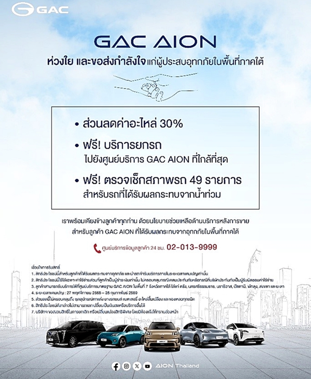 GAC AION Thailand ขอส่งกำลังใจและความห่วงใยอย่างสุดซึ้งไปยังพี่น้องประชาชนและลูกค้าในพื้นที่ภาคใต้ที่กำลังเผชิญวิกฤตอุทกภัย โดยบริษัทฯ ตระหนักถึงความเดือดร้อนและต้องการเป็นส่วนหนึ่งในการช่วยเหลือแบ่งเบาภาระค่าใช้จ่าย พร้อมดูแลรถยนต์ของท่านให้กลับมาใช้งานได้อย่างปลอดภัยโดยเร็วที่สุด จึงขอมอบมาตรการช่วยเหลือพิเศษ ดังนี้