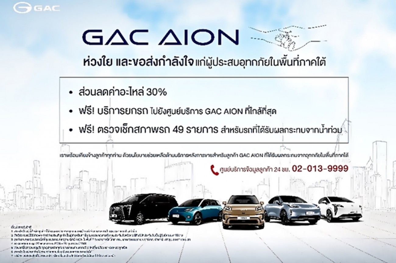 GAC AION Thailand ขอส่งกำลังใจและความห่วงใยอย่างสุดซึ้งไปยังพี่น้องประชาชนและลูกค้าในพื้นที่ภาคใต้ที่กำลังเผชิญวิกฤตอุทกภัย โดยบริษัทฯ ตระหนักถึงความเดือดร้อนและต้องการเป็นส่วนหนึ่งในการช่วยเหลือแบ่งเบาภาระค่าใช้จ่าย พร้อมดูแลรถยนต์ของท่านให้กลับมาใช้งานได้อย่างปลอดภัยโดยเร็วที่สุด จึงขอมอบมาตรการช่วยเหลือพิเศษ ดังนี้