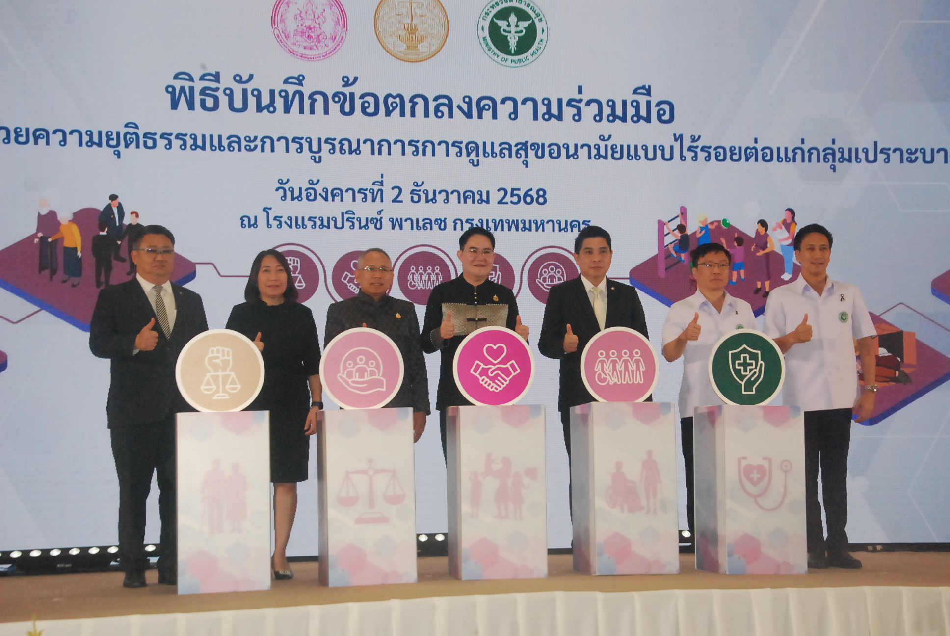 วันที่ 2 ธันวาคม 2568 : นายอัครา พรหมเผ่า รัฐมนตรีว่าการกระทรวงการพัฒนาสังคมและความมั่นคงของมนุษย์ (รมว.พม.) เป็นประธานในพิธีลงนามบันทึกข้อตกลงความร่วมมือ (MOU) ว่าด้วยการอำนวยความยุติธรรมและการบูรณาการการดูแลสุขอนามัยแบบไร้รอยต่อแก่กลุ่มเปราะบาง ระหว่างกระทรวงการพัฒนาสังคมและความมั่นคงของมนุษย์ (พม.) กระทรวงยุติธรรม (ยธ.) และกระทรวงสาธารณสุข (สธ.) พร้อมทั้งเปิดกิจกรรม Kick off การอำนวยความยุติธรรมและการบูรณาการการดูแลสุขอนามัยแบบไร้รอยต่อแก่กลุ่มเปราะบาง โดยมีนายกันตพงศ์ รังษีสว่าง ปลัดกระทรวงการพัฒนาสังคมและความมั่นคงของมนุษย์, นางพงษ์สวาท นีละโยธิน ปลัดกระทรวงยุติธรรม และนายแพทย์โสภณ เอี่ยมศิริถาวร รองปลัดกระทรวงสาธารณสุข ร่วมลงนาม MOU อีกทั้ง นายกองตรี ดร.ธนกฤต จิตรอารีย์รัตน์ เลขานุการรัฐมนตรีว่าการกระทรวงการพัฒนาสังคมและความมั่นคงของมนุษย์ ร่วมเป็นสักขีพยาน พร้อมด้วย นายยอดศักดิ์ รักษาแก้ว ที่ปรึกษารัฐมนตรีว่าการกระทรวงสาธารณสุข, นางสาวสุนีย์ ศรีสง่าตระกูลเลิศ รองปลัดกระทรวงการพัฒนาสังคมและความมั่นคงของมนุษย์ และคณะผู้บริหารกระทรวง พม. ยธ. และ สธ. เข้าร่วมงาน ณ โรงแรมปริ๊นซ์ พาเลซ กรุงเทพมหานคร
