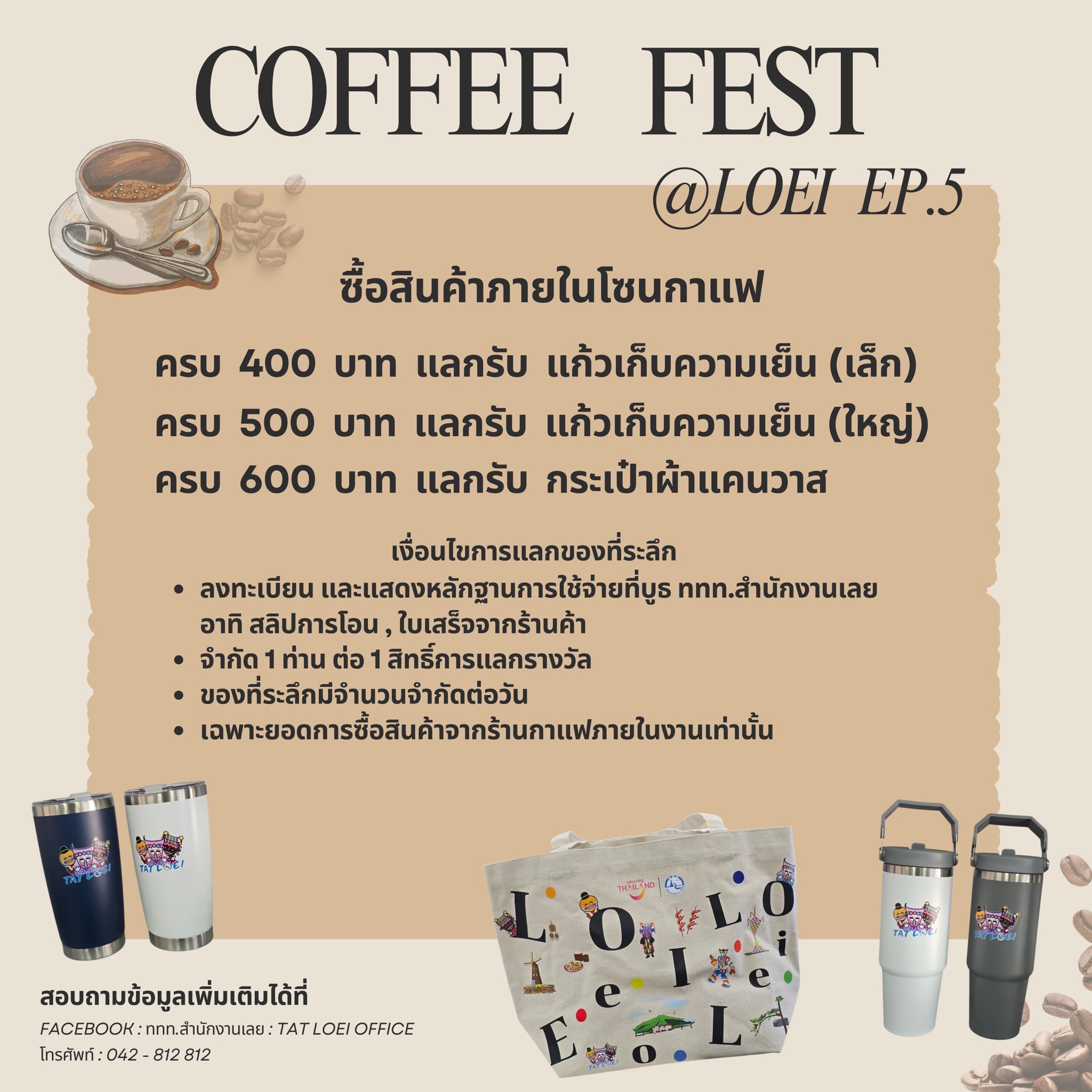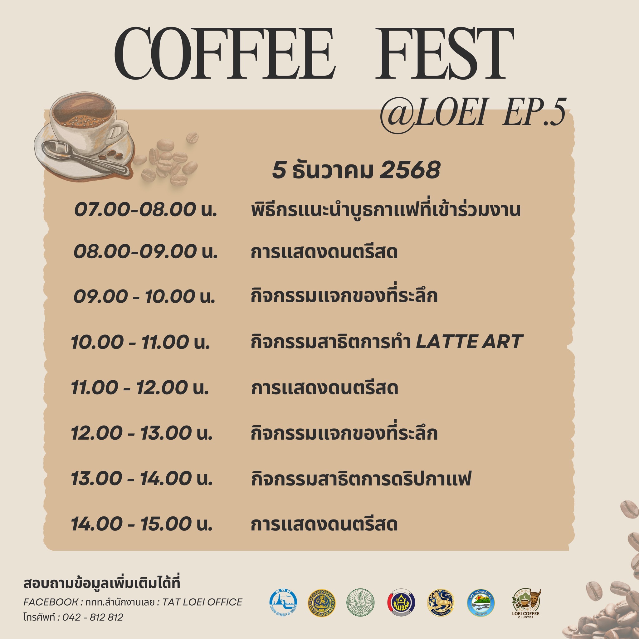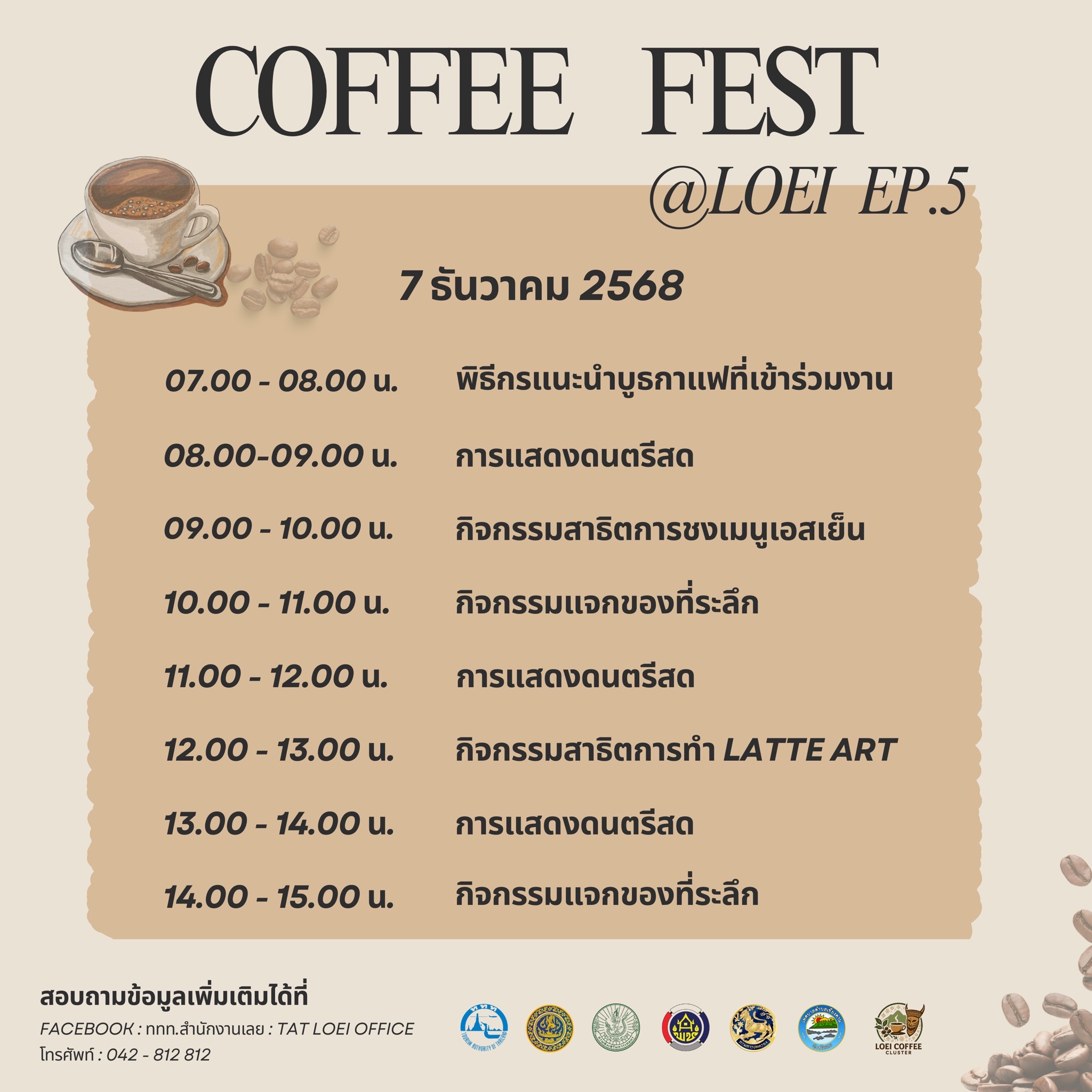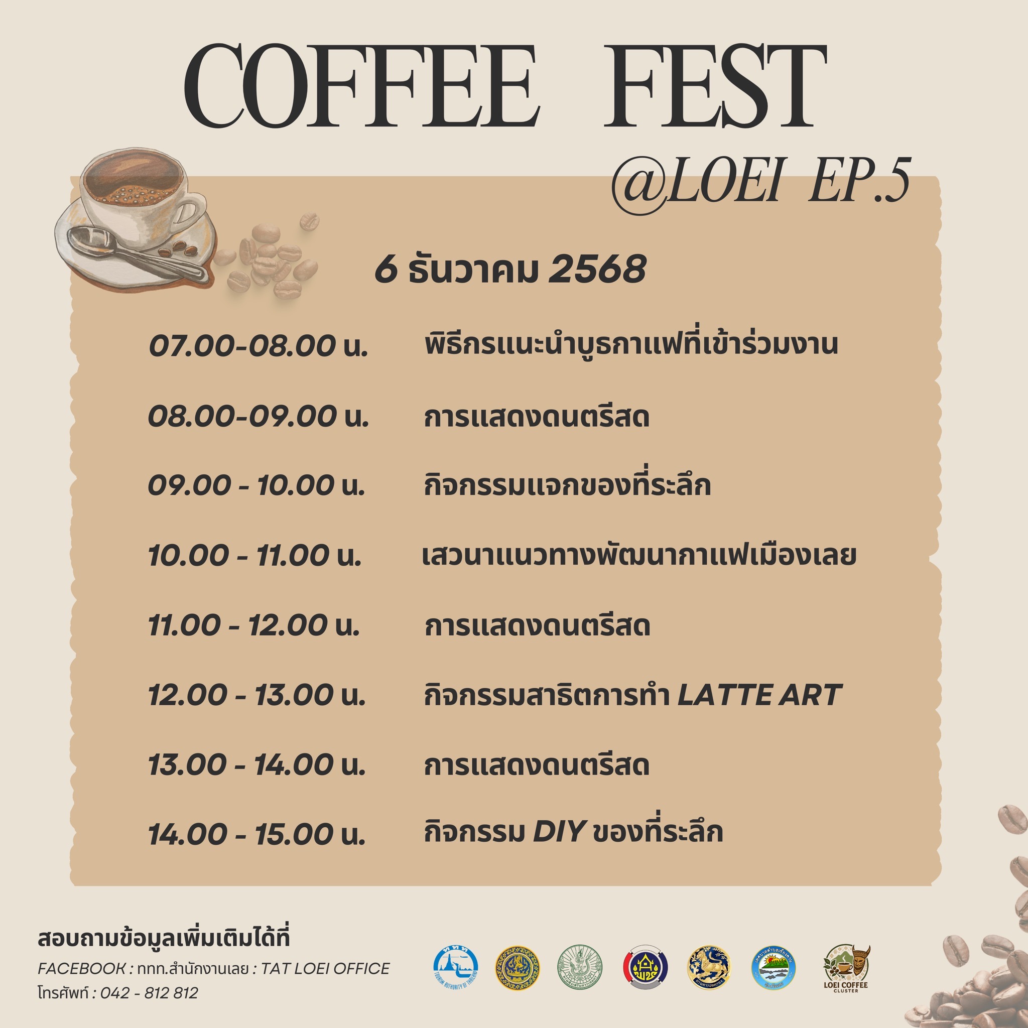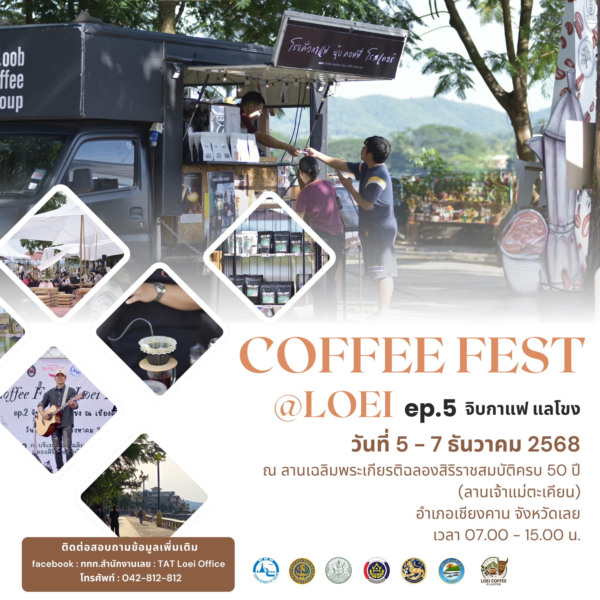 วันที่ 5 ธันวาคม 2568 จังหวัดเลยร่วมกับการท่องเที่ยวแห่งประเทศไทย (ททท.) สำนักงานเลย สำนักงานพาณิชย์จังหวัดเลย สำนักงานเกษตรจังหวัดเลย เทศบาลตำบลเชียงคาน กลุ่มคลัสเตอร์กาแฟจังหวัดเลย และผู้ประกอบการร้านกาแฟในพื้นที่ จัดงาน Coffee Fest @ Loei EP.5 “จิบกาแฟ แลโขง” ระหว่างวันที่ 5–7 ธันวาคม 2568 เวลา 07.00–15.00 น. ณ สวนเฉลิมพระเกียรติฉลองสิริราชสมบัติครบ 50 ปี อำเภอเชียงคาน จังหวัดเลย เพื่อส่งเสริมศักยภาพอุตสาหกรรมกาแฟและเบเกอรี่ รวมทั้งกระตุ้นการท่องเที่ยวในจังหวัดเลยช่วงฤดูกาลท่องเที่ยว ภายในงานได้รับเกียรติจาก นายชัยพจน์ จรูญพงศ์ ผู้ว่าราชการจังหวัดเลย ร่วมเปิดงานและร่วมกิจกรรมดริปกาแฟ พร้อมเยี่ยมชมและให้กำลังใจผู้ประกอบการพื้นที่