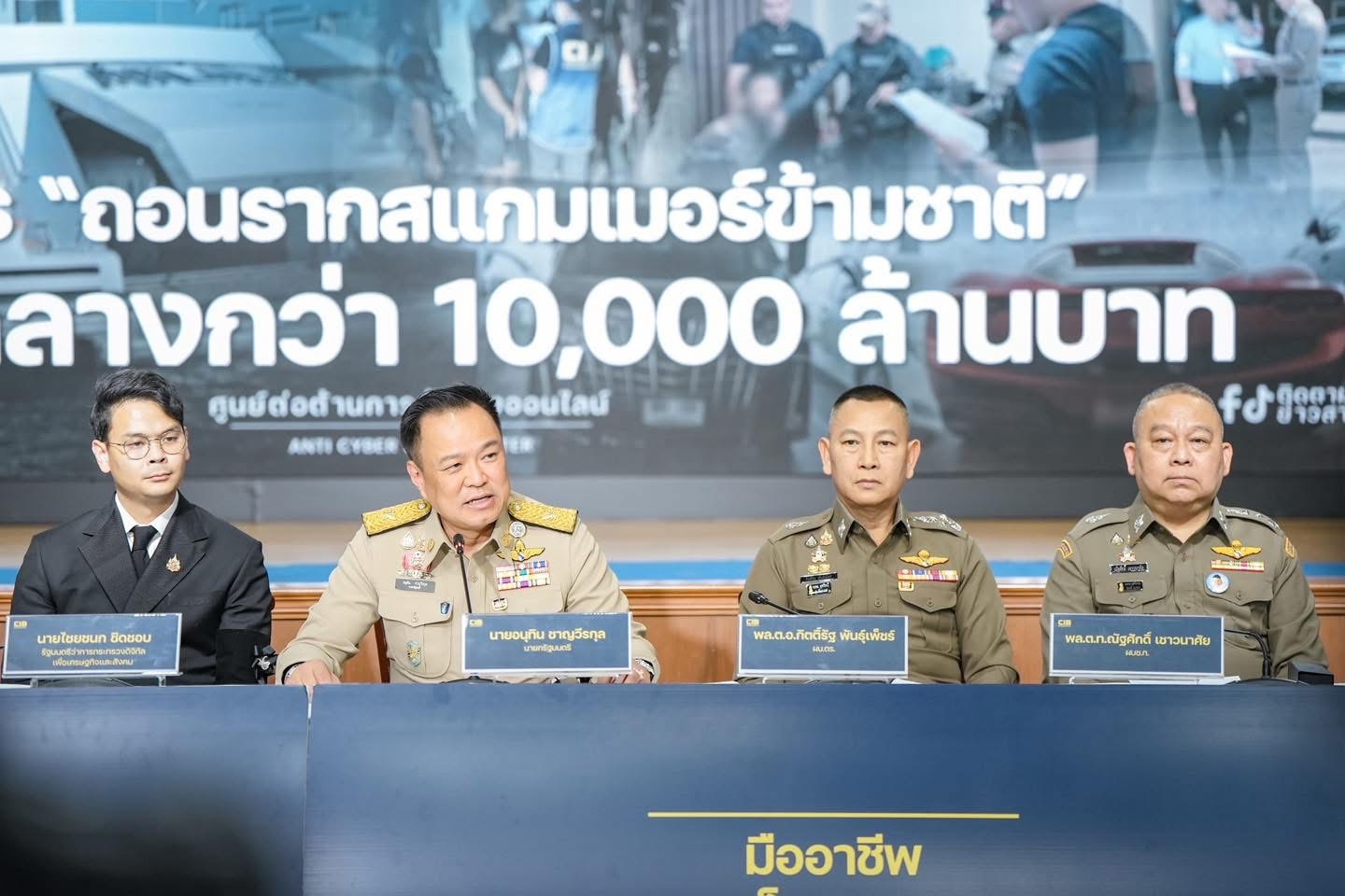 นายอนุทิน ชาญวีรกูล นายกรัฐมนตรี ในฐานะประธานกรรมการ คณะกรรมการอำนวยการป้องกันและปราบปรามการกระทำความผิดอาชญากรรมทางเทคโนโลยี พล.ต.ท.รุทธพล เนาวรัตน์ รัฐมนตรีว่าการกระทรวงยุติธรรม, นายไชยชนก ชิดชอบ รัฐมนตรีว่าการกระทรวงดิจิทัลเพื่อเศรษฐกิจและสังคม ในฐานะรองประธานกรรมการ โดยมี พล.ต.อ.กิตติ์รัฐ พันธุ์เพ็ชร์ ผู้บัญชาการตำรวจตำรวจแห่งชาติ นายเทพสุ บวรโชติดารา เลขาธิการ สำนักงานป้องกันและปราบปรามการฟอกเงิน แถลงผลงาน ศูนย์ปราบปรามอาชญากรรมทางเทคโนโลยีสารสนเทศ สำนักงานตำรวจแห่งชาติ (ศปอส.ตร.) ร่วมกับสำนักงานป้องกันและปราบปรามการฟอกเงิน(ปปง.) เปิดยุทธการถอนรากสแกมเมอร์ข้ามชาติฯ