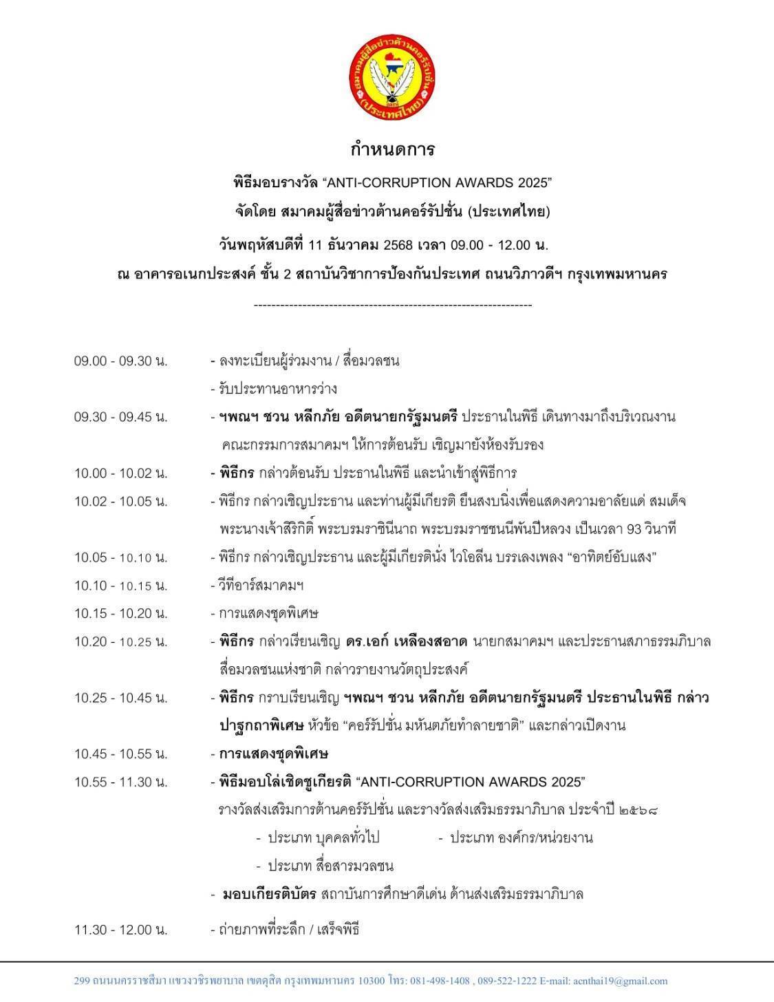 นายกสมาคมผู้สื่อข่าวต้านคอร์รัปชั่นฯ กล่าวว่า การจัดงานครั้งนี้ สมาคมฯ ได้รับเกียรติจาก ฯพณฯ ชวน หลีกภัย อดีตนายกรัฐมนตรี เป็นประธานในพิธี และกล่าวปาฐกถาพิเศษ หัวข้อ “คอร์รัปชั่น มหันตภัยทำลายชาติ” พร้อมมอบโล่เชิดชูเกียรติ “ANTI-CORRUPTION AWARDS 2025” รางวัลส่งเสริมการต้านคอร์รัปชั่น และรางวัลส่งเสริมธรรมาภิบาล ประจำปี 2568 ประเภทองค์กร/หน่วย บุคคลทั่วไป และสื่อสารมวลชน พร้อมมอบเกียรติบัตรสถาบันการศึกษาดีเด่น ด้านส่งเสริมธรรมาภิบาล