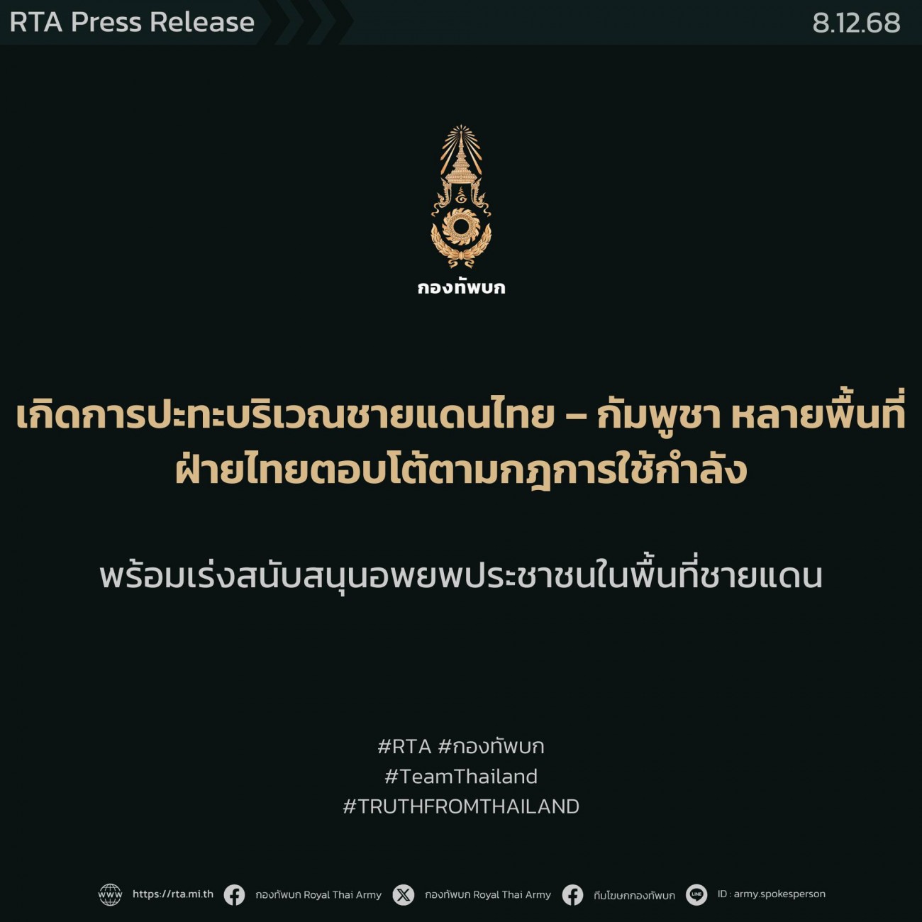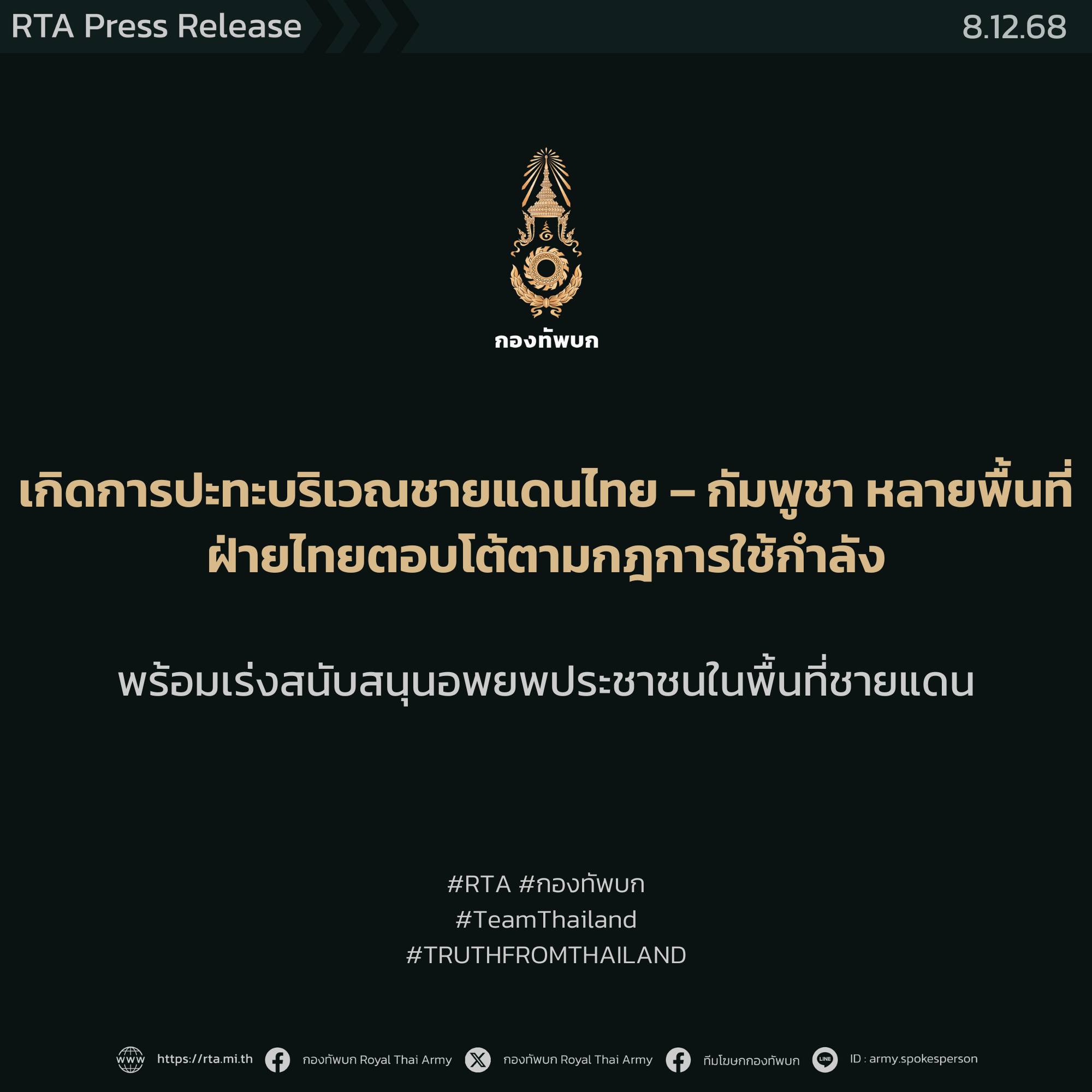 ทบ.เผยเกิดการปะทะชายแดนไทย – กัมพูชา ในหลายพื้นที่ ฝ่ายไทยตอบโต้ตามกฎการใช้กำลัง พร้อมเร่งสนับสนุนอพยพประชาชนในพื้นที่ชายแดน