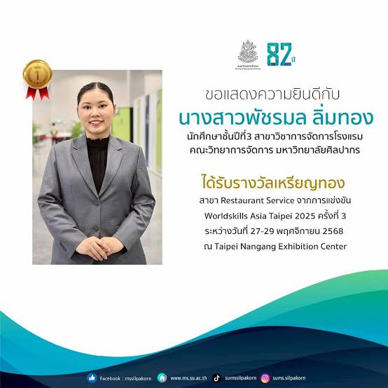มหาวิทยาลัยศิลปากร ขอแสดงความภาคภูมิใจและยินดีอย่างยิ่งกับความสำเร็จระดับนานาชาติของ นางสาวพัชรมล ลิ่มทอง นักศึกษาชั้นปีที่ 3 สาขาวิชาการจัดการโรงแรม ที่สามารถคว้ารางวัลเหรียญทอง (Gold Medal) สาขา Restaurant Service จากเวทีการแข่งขัน WorldSkills Asia Taipei 2025 ครั้งที่ 3 ณ กรุงไทเป ประเทศไต้หวัน