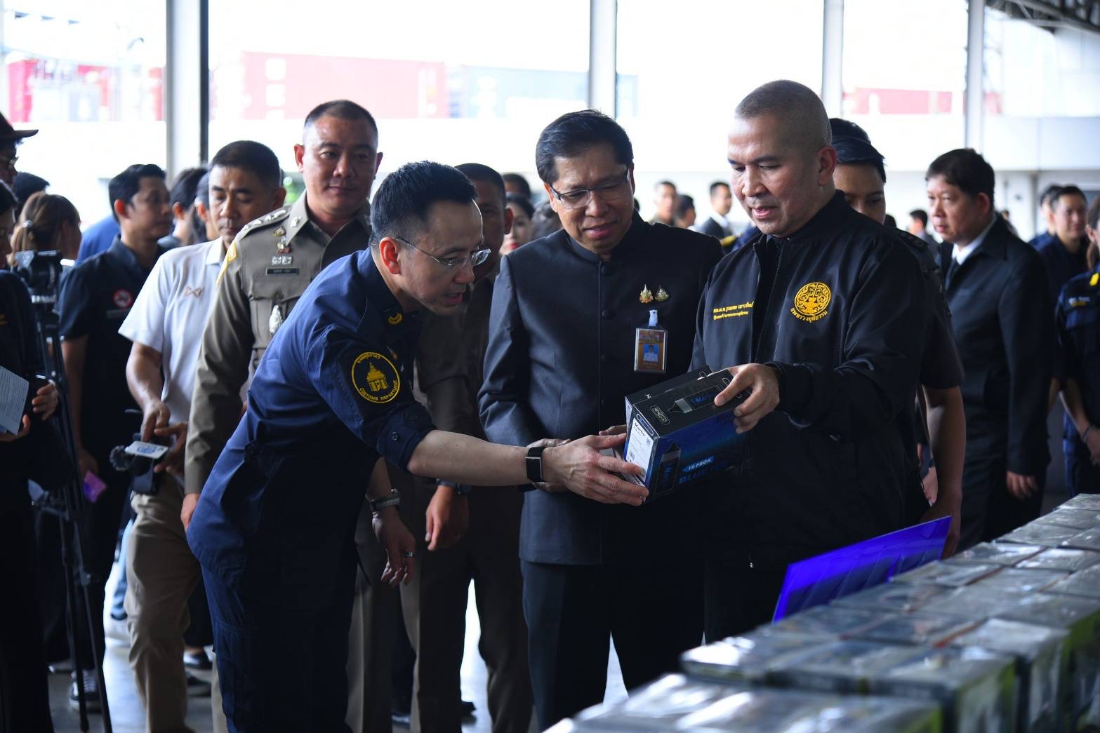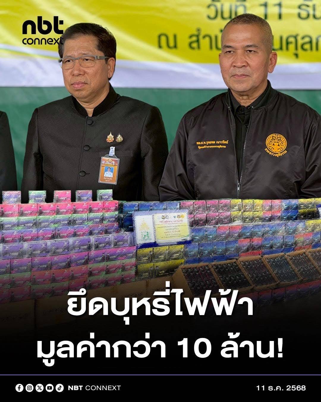วันที่ 11 ธันวาคม 2568 นายสันติ ปิยะทัต รัฐมนตรีประจำสำนักนายกรัฐมนตรี พล.ต.ท.รุทธพล เนาวรัตน์ รัฐมนตรีว่าการกระทรวงยุติธรรม พ.ต.ต.ยุทธนา แพรดำ อธิบดีกรมสอบสวนคดีพิเศษ นายพันธ์ทอง ลอยกุลนันท์ อธิบดีกรมศุลกากร ผศ.อัครนันท์ อริยศรีพงษ์ ที่ปรึกษารัฐมนตรีช่วยว่าการกระทรวงสาธารณสุข นางสาวสุนทรียา ทวิชาประสิทธิ์ รองอธิบดีกรมศุลกากร นายรณรงค์ พูลพิพัฒน์ เลขาธิการคณะกรรมการคุ้มครองผู้บริโภค นายธนกฤต ลิ้นทอง ผู้อำนวยการสำนักงานศุลกากรท่าเรือกรุงเทพ พล.ต.ต. ทัศน์ภูมิ จารุปรัชน์ ผู้บังคับการปราบปรามการกระทำความผิดเกี่ยวกับอาชญากรรมทางเศรษฐกิจ กองบัญชาการตำรวจสอบสวนกลาง นายแพทย์ชยนันท์ สิทธิบุศย์ ผู้อำนวยการกองงานคณะกรรมการควบคุมผลิตภัณฑ์ยาสูบ กรมควบคุมโรค นายกฤษดา สุขการีย์ รองผู้อํานวยการฝ่ายปฏิบัติการเรือและสินค้า การท่าเรือแห่งประเทศไทย ร่วมแถลงข่าวตรวจยึด “บุหรี่ไฟฟ้า” ชนิดใช้แล้วทิ้ง จำนวน 46,260 ชิ้น มูลค่า 10,871,100 บาท ซึ่งเป็นของต้องห้ามในการนำเข้ามาในราชอาณาจักร ณ สำนักงานศุลกากรท่าเรือกรุงเทพ กรมศุลกากร