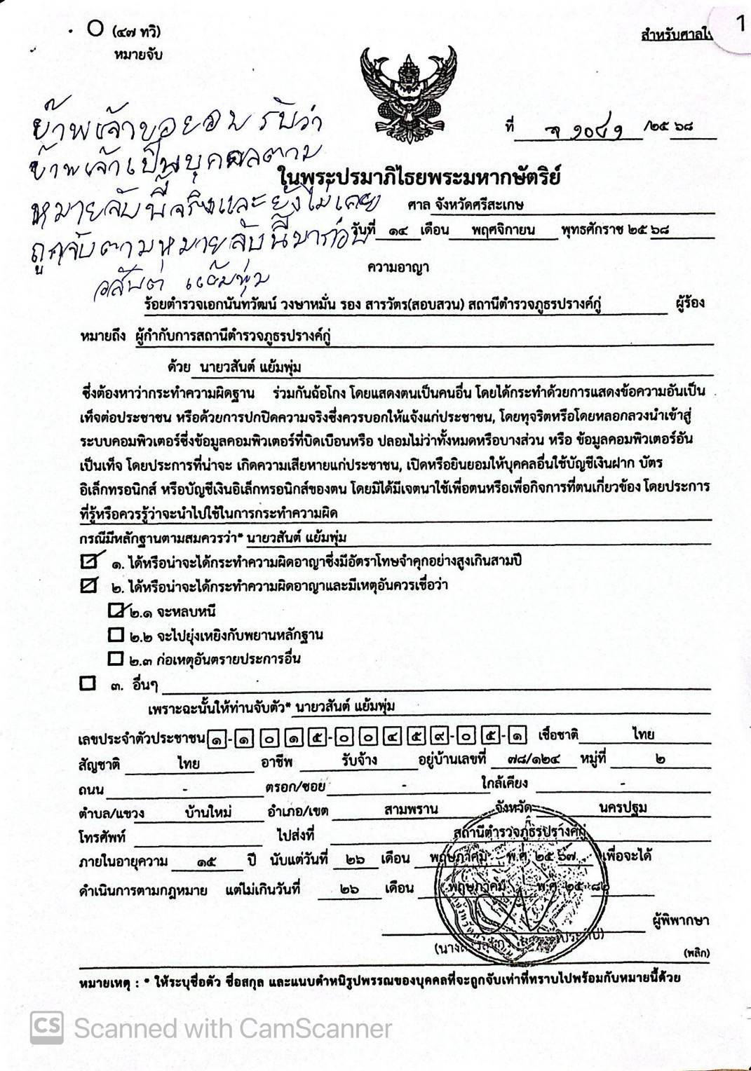 พฤติการณ์กล่าวคือ วันเวลาดังกล่าว (14 ธ.ค.2568) เจ้าหน้าที่ตำรวจชุดจับกุมได้รับแจ้งจากสายลับไม่ประสงค์ออกนามแต่ประสงค์เงินรางวัลนำจับ ว่าพบนายวสันต์หรือนิก แย้มพุ่ม ผู้ต้องหาตามหมายจับ ศาลจังหวัด ศรีสะเกษ อยู่บริเวณดังกล่าว จึงเดินทางไปตรวจสอบ เมื่อไปถึงพบนายวสันต์หรือนิก แย้มพุ่ม ยืนอยู่ที่บริเวณดังกล่าวข้างต้นมีลักษณะตำหนิรูปพรรณตรงตามที่สายลับแจ้งมา เมื่อพบนายวสันต์หรือนิก แย้มพุ่ม เห็นเจ้าหน้าที่ตำรวจได้แสดงอาการมีพิรุธ จึงได้เรียกให้หยุด และแสดงตนเป็นเจ้าหน้าที่ตำรวจขอตรวจค้น โดยก่อนตรวจค้นเจ้าหน้าที่ชุดจับกุมได้แสดงความบริสุทธิ์ใจให้ นายวสันต์หรือนิก แย้มพุ่ม ดูเป็นที่พอใจแล้ว และบริเวณนั้นมีไฟส่องสว่างจากไฟฟ้าหน้าเซเว่นฯ ไฟฟ้าส่องสว่างจากทางสาธารณะและไฟส่องสว่างจากไฟฉายของเจ้าหน้าที่ชุดจับกุม ผลการตรวจค้นไม่พบสิ่งผิดกฎหมาย แต่นายวสันต์หรือนิกฯ ยังมีอาการพิรุธอยู่ เจ้าหน้าที่ชุดจับกุมจึงตรวจสอบบุคคลตามหมายจับผ่านระบบ CRIME ONLINE ปรากฏว่าเป็นบุคคลตามหมายจับของ สภ.ปรางค์กู่ ศาลจังหวัดศรีสะเกษ ที่ จ.1041/2568 ลงวันที่14 พฤศจิกายน 2568 ข้อหากระทำความผิดฐาน “ร่วมกันฉ้อโกง โดยแสดงตนเป็นคนอื่น โดยได้กระทำด้วยการแสดงข้อความอันเป็นเท็จต่อประชาชน หรือด้วยการปกปิดความจริง ซึ่งควรบอกให้แจ้งแก่ประชาชน, โดยทุจริตหรือโดยหลอกลวงนำเข้าสู่ระบบคอมพิวเตอร์ซึ่งข้อมูลคอมพิวเตอร์ที่บิดเบือนหรือ ปลอมไม่ว่าทั้งหมดหรือบางส่วน หรือ ข้อมูลคอมพิวเตอร์อันเป็นเท็จ โดยประการที่น่าจะเกิดความเสียหายแก่ประชาชน, เปิดหรือยินยอมให้บุคคลอื่นใช้บัญชีเงินฝาก บัตรอิเล็กทรอนิกส์ หรือบัญชีเงินอิเล็กทรอนิกส์ของตน โดยมิได้มีเจตนาใช้เพื่อตนหรือตนเพื่อกิจการที่ตนเกี่ยวข้องโดนประการที่รู้หรือควรรู้ว่าจะนำไปใช้ในการกระทำความผิด” ตามหมายจับ ศาลจังหวัดศรีสะเกษ ที่ จ.1041/2568 ลงวันที่ 14 พฤศจิกายน 2568 เจ้าหน้าที่ชุดจับกุมจึงได้เชิญตัวนายวสันต์หรือนิกฯ มาที่ สน.เพชรเกษม เพื่อตรวจสอบยืนยันหมายจับอีกครั้ง ปรากฏว่า ทาง สภ.ปรางค์กู่ ยืนยันว่ายังต้องการตัวมาดำเนินคดีอยู่ จากนั้นได้ร่วมกันแสดงหมายจับให้ นายวสันต์หรือนิกฯ ดู และอ่าน ข้อความตามหมายให้ฟัง นายวสันต์หรือนิกฯ ทราบและเข้าใจดีแล้ว รับว่าเป็นบุคคลตามหมายจับจริง และยังไม่เคยถูกจับกุมตัวมาดำเนินคดีตามหมายจับนี้มาก่อน จึงได้แจ้งข้อกล่าวหาให้ทราบและควบคุมตัวนำส่งศาลจังหวัดศรีสะเกษ เพื่อดำเนินคดีตามกฎหมาย