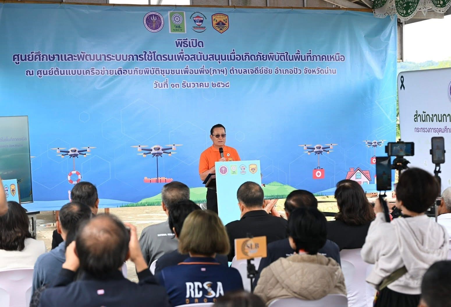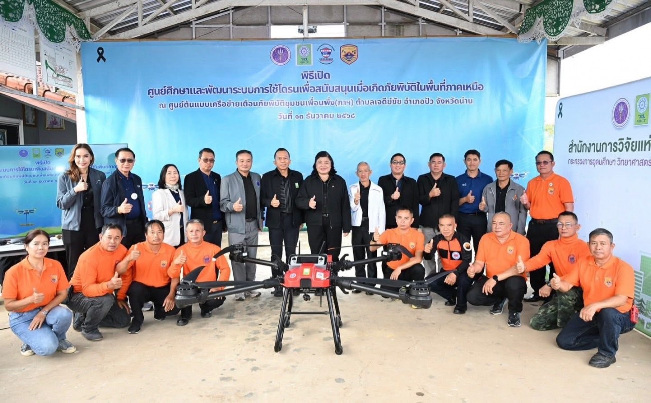 เมื่อวันที่ 13 ธันวาคม 2568 สำนักงานการวิจัยแห่งชาติ(วช.) กระทรวงการอุดมศึกษา วิทยาศาสตร์ วิจัยและนวัตกรรม (อว.) ร่วมกับ สมาคมกีฬาเครื่องบินจําลองและวิทยุบังคับ จัด “พิธีเปิดการจัดตั้งศูนย์ศึกษาและพัฒนาระบบการใช้โดรนเพื่อสนับสนุนเมื่อเกิดภัยพิบัติในพื้นที่ภาคเหนือ” โดย ดร.วิภารัตน์ ดีอ่อง ผู้อำนวยการสำนักงานการวิจัยแห่งชาติ เป็นประธาน พร้อมด้วย นายอิทธิฤทธิ์ ยะแสง กํานันตําบลเจดีย์ชัยและหัวหน้าศูนย์การจัดการภัยพิบัติตําบลเจดีย์ชัย กล่าวขอบคุณ, นายพิศิษฐ์ มิตรเกื้อกูล นายกสมาคมกีฬาเครื่องบินจําลองและวิทยุบังคับ กล่าวถึงที่มาของโครงการ, นายสมเกียรติ สุขโข ปลัดอาวุโสอำเภอปัว กล่าวต้อนรับ และผู้ทรงคุณวุฒิ (วช.) เข้าร่วมในพิธี ณ ศูนย์ต้นแบบเครือข่ายเตือนภัยพิบัติชุมชนเพื่อนพึ่ง(ภาฯ) ตําบลเจดีย์ชัย อําเภอปัว จังหวัดน่าน