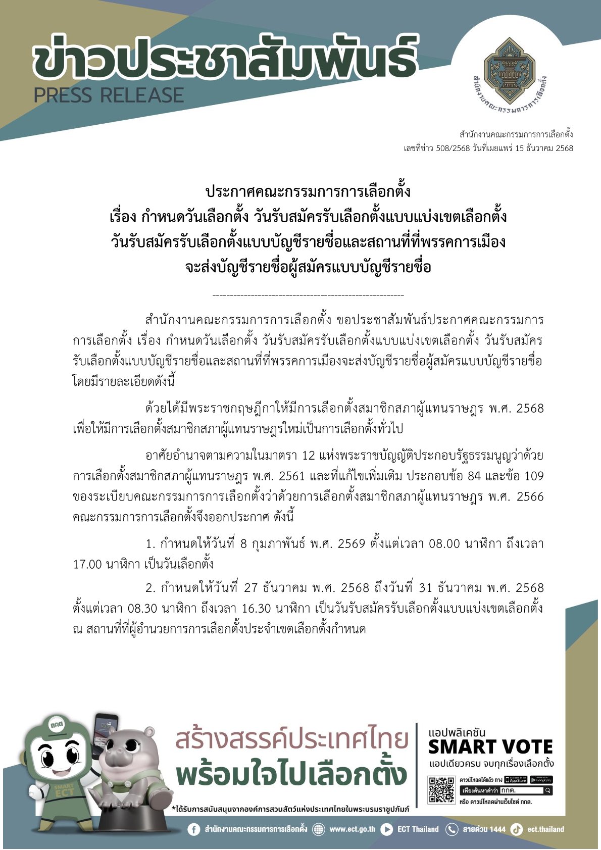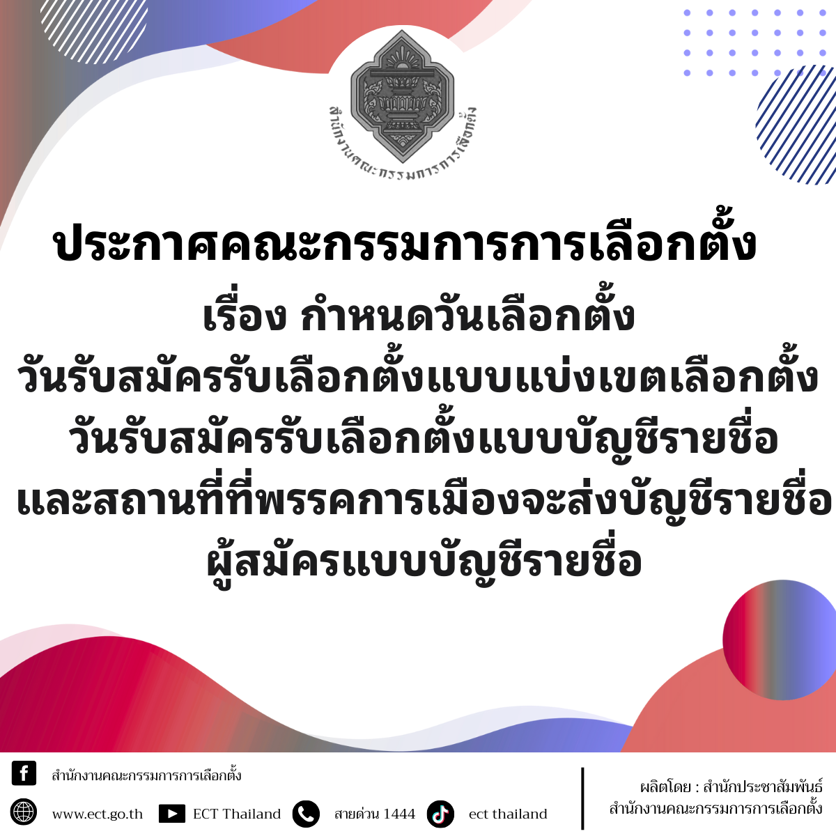 สำนักงานคณะกรรมการการเลือกตั้ง ขอประชาสัมพันธ์ประกาศคณะกรรมการการเลือกตั้ง เรื่อง กำหนดวันเลือกตั้ง วันรับสมัครรับเลือกตั้งแบบแบ่งเขตเลือกตั้ง วันรับสมัคร รับเลือกตั้งแบบบัญชีรายชื่อและสถานที่ที่พรรคการเมืองจะส่งบัญชีรายชื่อผู้สมัครแบบบัญชีรายชื่อโดยมีรายละเอียดดังนี้