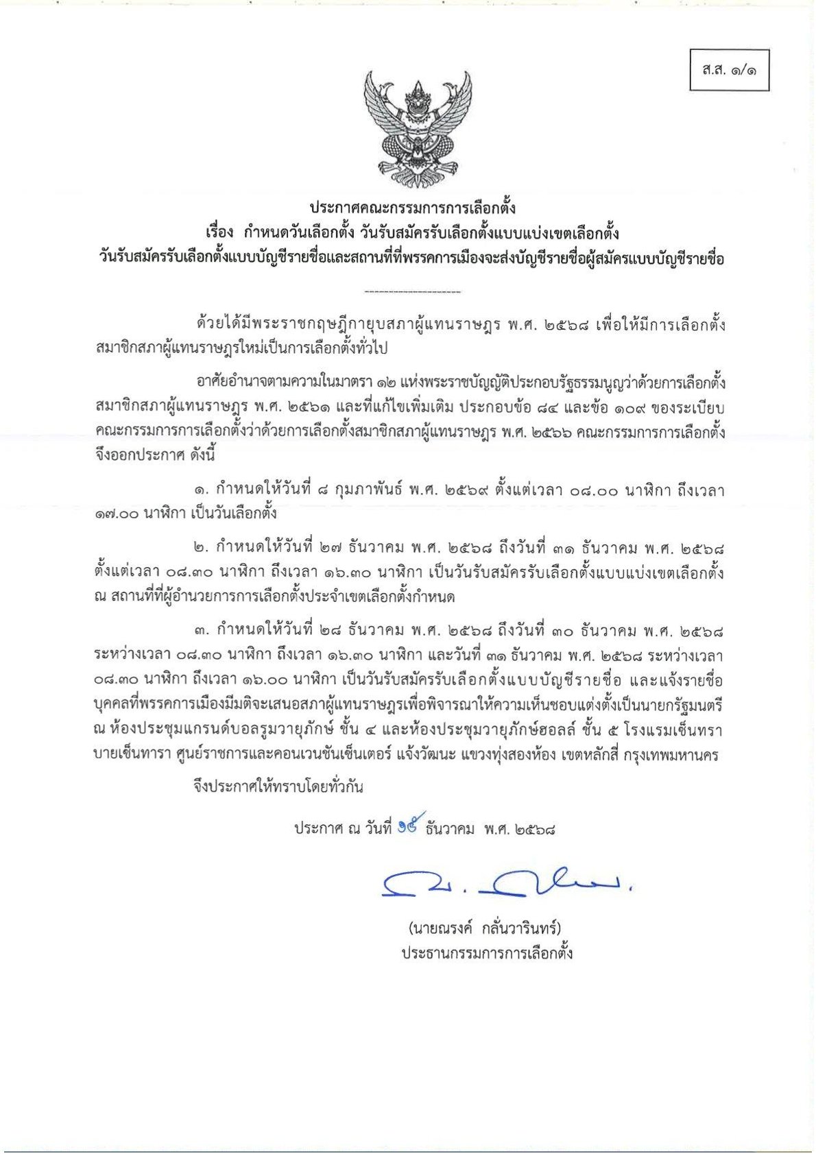 1. กำหนดให้วันที่ 8 กุมภาพันธ์ พ.ศ. 2569 ตั้งแต่เวลา 08.00 นาฬิกา ถึงเวลา 17.00 นาฬิกา เป็นวันเลือกตั้ง