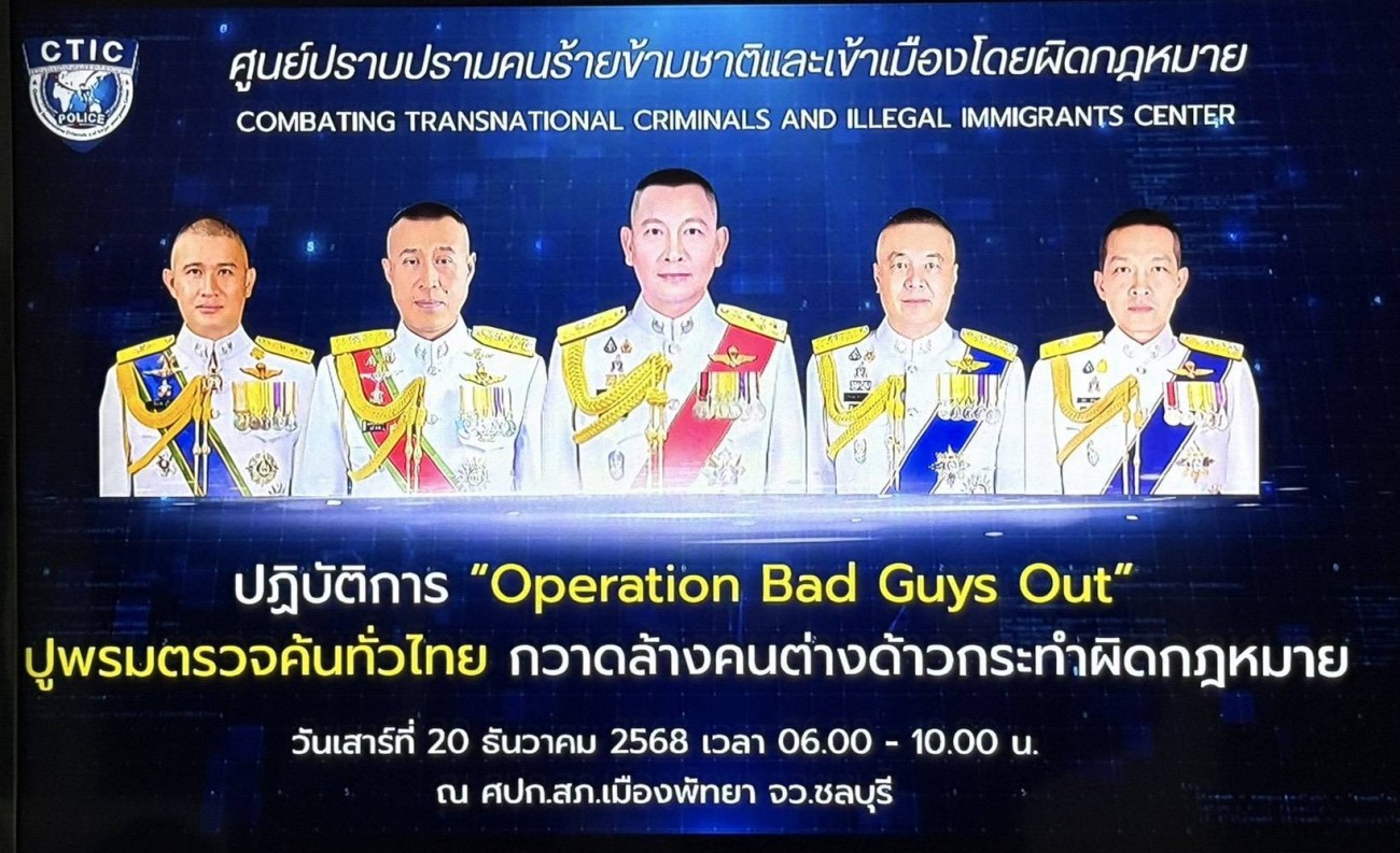 20 ธันวาคม 2568 พล.ต.อ.สำราญ นวลมา รองผู้บัญชาการตำรวจแห่งชาติ (รอง ผบ.ตร.) ลงพื้นที่ติดตามความคืบหน้าปฏิบัติการ “OPERATION BAD GUYS OUT” ปูพรมตรวจค้นและกวาดล้างคนต่างด้าวทุกสัญชาติที่กระทำผิดกฎหมายทั่วประเทศ รวมกว่า 144 จุด โดยมีการประชุมสั่งการผ่านระบบประชุมทางไกล (Zoom) รายงานสถานการณ์แบบเรียลไทม์ ณ ห้องประชุม ศปก.สภ.เมืองพัทยา ในการประชุมดังกล่าวมีผู้บริหารระดับสูงของสำนักงานตำรวจแห่งชาติเข้าร่วมอย่างพร้อมเพรียง อาทิ พล.ต.ท.ภาณุมาศ บุญญลักษม์ ผบช.สตม., พล.ต.ต.พันธนะ นุชนารถ รอง ผบช.สตม., พล.ต.ต.พงศ์พันธ์ วงษ์มณีเทศ ผบก.ภ.จว.ชลบุรี, พ.ต.อ.เอนก สระทองอยู่ ผกก.สภ.เมืองพัทยา และ พ.ต.อ.นภัสพงษ์ โฆษิตสุริยมณี ผกก.ตม.จว.ชลบุรี รวมถึงหน่วยงานที่เกี่ยวข้อง