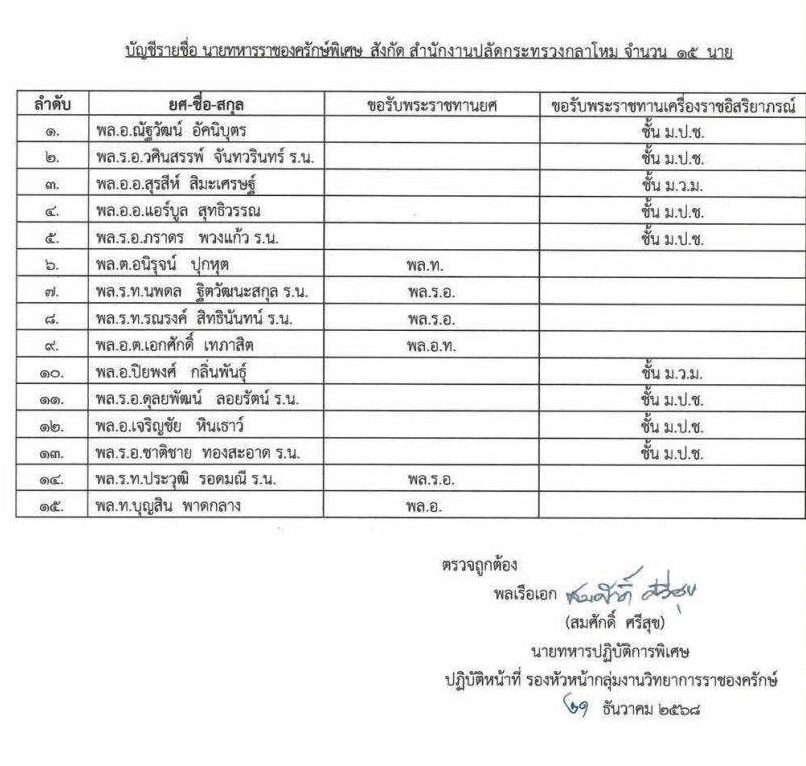 ในหลวง ทรงพระกรุณาโปรดเกล้า ฯ พระราชทานยศทหาร และพระราชทานเครื่องราชอิสริยาภรณ์ เป็นกรณีพิเศษให้นายทหารราชองครักษ์พิเศษ จำนวน 15 นาย โดยกำหนดพิธีเข้ารับพระราชทานประดับเครื่องหมายยศ และพิธีเข้ารับพระราชทานเครื่องราชอิสริยาภรณ์ เบื้องหน้าพระบรมฉายาลักษณ์ ในวันอาทิตย์ที่ 28 ธันวาคม 2568เวลา 09.00 น. ณ อาคาร 606 สนามเสือป่า พระราชวังดุสิต