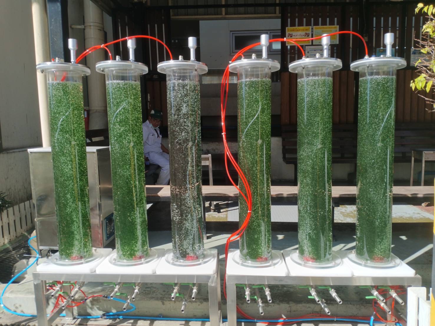 โครงการบริการวิจัยการประยุกต์ใช้ระบบปฏิกรณ์ชีวภาพจากสาหร่ายขนาดเล็กฯ มีวัตถุประสงค์เพื่อออกแบบและพัฒนาระบบปฏิกรณ์ชีวภาพจากสาหร่ายขนาดเล็กที่สามารถติดตั้งได้ในพื้นที่จำกัดของโรงงาน วิเคราะห์และประเมินประสิทธิภาพเชิงปริมาณของระบบในการลดปริมาณ CO2 ในอากาศบริเวณพื้นที่สูบบุหรี่ ณ โรงงานในนิคมอุตสาหกรรมลาดกระบัง จำนวน 3 จุด ควบคู่กับการสร้างต้นแบบที่ช่วยปรับปรุงทัศนียภาพและคุณภาพอากาศ ซึ่งสามารถต่อยอดสู่การพัฒนาเชิงพาณิชย์ และเป็นแหล่งเรียนรู้ด้านนวัตกรรมสิ่งแวดล้อมสำหรับบุคลากรภายในองค์กร รวมถึงการประยุกต์ใช้และการนำไปใช้ประโยชน์ของสิทธิบัตรการผลิตสาหร่ายอย่างเป็นรูปธรรมต่อไป