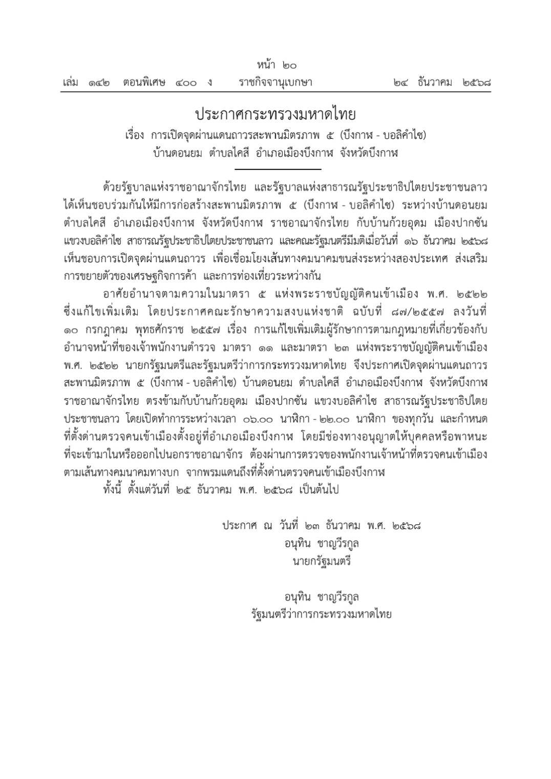 “ขณะนี้ นายอนุทิน ชาญวีรกูล นายกรัฐมนตรีและรัฐมนตรีว่าการกระทรวงมหาดไทย ได้ลงนามประกาศกระทรวงมหาดไทย เรื่อง การเปิดจุดผ่านแดนถาวรสะพานมิตรภาพ 5 (บึงกาฬ – บอลิคำไซ) บ้านดอนยม ตำบลไคสี อำเภอเมืองบึงกาฬ จังหวัดบึงกาฬ ตั้งแต่วันที่ 25 ธ.ค. 68 เป็นต้นไป โดยเปิดทำการตั้งแต่เวลา 06.00 – 22.00 น. ทุกวัน ซึ่งบุคคลหรือยานพาหนะที่เข้ามาในราชอาณาจักรไทยหรือออกไปนอกราชอาณาจักรไทย ต้องผ่านการตรวจของเจ้าหน้าที่ตรวจคนเข้าเมือง (ตม.) ตามเส้นทางคมนาคมทางบกจากพรมแดนถึงที่ตั้งด่านตรวจคนเข้าเมืองบึงกาฬ ซึ่งขณะนี้ได้ประกาศในราชกิจจานุเบกษาแล้ว” นายอรรษิษฐ์ กล่าว