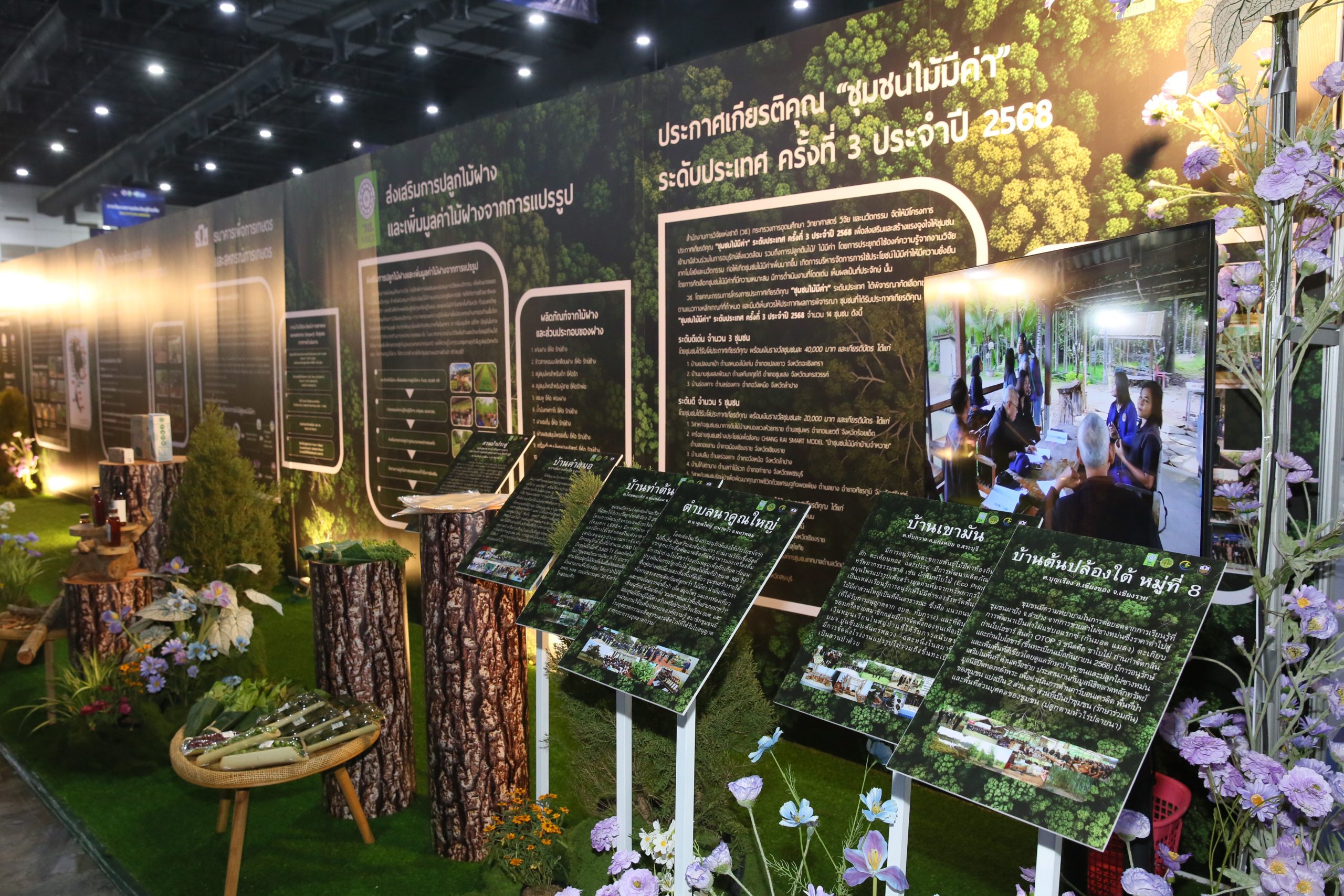 นอกจากนี้ ยังมีการเสวนา “ไม้มีค่า สร้างป่า สร้างคน ชุมชนยั่งยืน” โดยผู้นําชุมชนที่ได้รับรางวัลประกาศเกียรติคุณ “ชุมชนไม้มีค่า” ระดับประเทศ ครั้งที่ 3 ประจําปี 2568 ระดับ “ดีเด่น” ดังนี้ นายวรพจน์ นากวิกรัย บ้านแปลงนกเป้า จังหวัดฉะเชิงเทรา,นายบุญธรรม ทับทิมศรี บ้านมาบชุมแสงพัฒนา จังหวัดนครสวรรค์ และนายอดิเรก สวยสด บ้านร่องเคาะ จังหวัดลําปาง ดำเนินรายการโดย นายประลอง ดำรงค์ไทย กรรมการโครงการประกาศเกียรติคุณ “ชุมชนไม้มีค่า” ระดับประเทศ ได้สะท้อนประเด็นสำคัญในการพลิกฟื้นผืนดินสู่ความมั่งคั่ง ที่ไม่ได้มุ่งเน้นเพียงการเพิ่มพื้นที่สีเขียว แต่เป็นการยกระดับชุมชนให้เป็นต้นแบบ โดยแบ่งการดำเนินงานเป็น 2 ระยะ คือ ระยะที่ 1 (2566–2570) ขยายฐานกลุ่มเป้าหมายใหม่ และ ระยะที่ 2 (2571 เป็นต้นไป) ยกระดับสู่ต้นแบบที่ยั่งยืน ซึ่ง (วช.) พร้อมผลักดันโมเดลจากทั้ง 3 ชุมชนนี้ให้เป็นศูนย์กลางการเรียนรู้และสร้างความเข้มแข็งให้แก่เศรษฐกิจฐานรากต่อไป