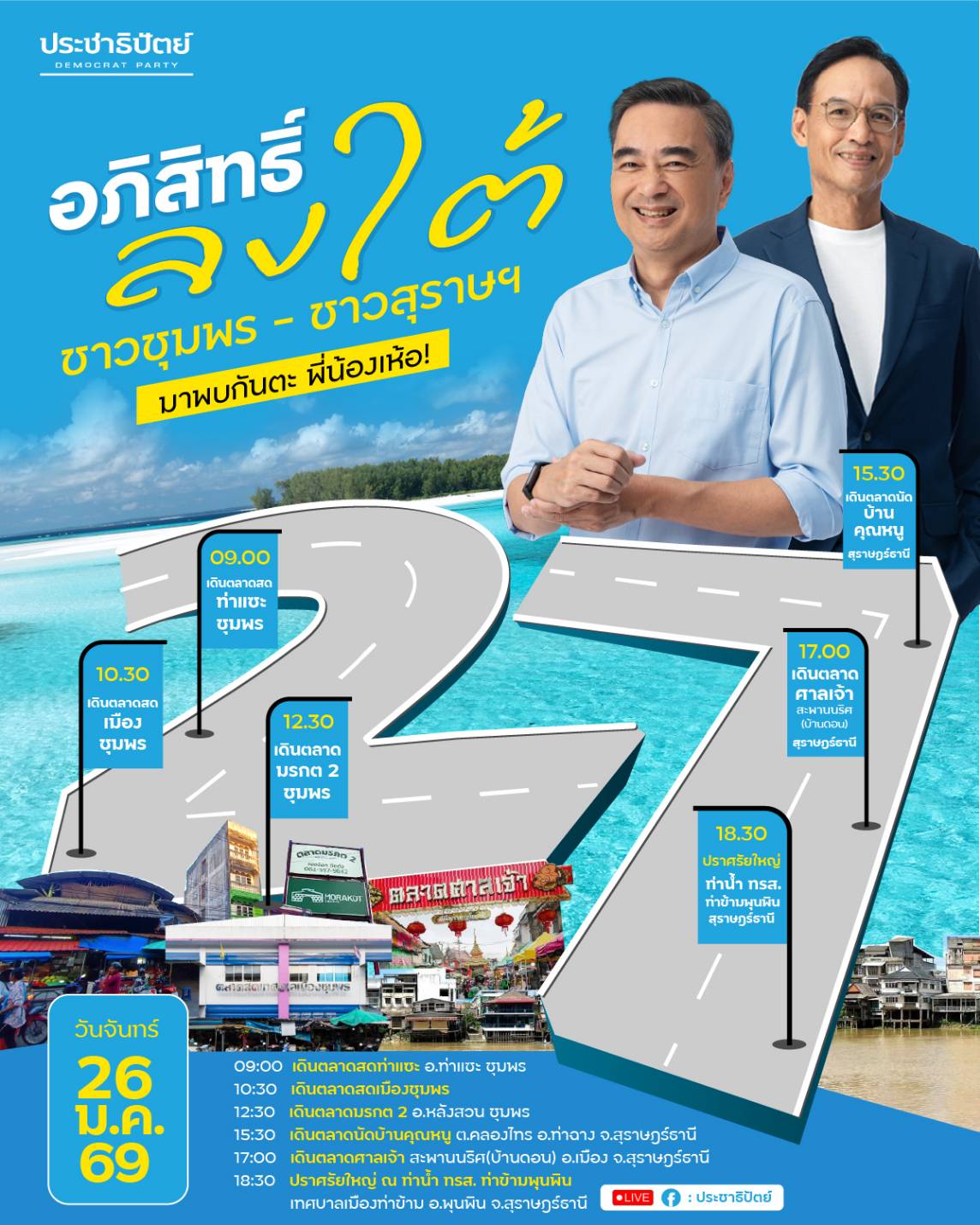 26 มกราคม 2569 บรรยากาศการลงพื้นที่จังหวัดชุมพรของ นายอภิสิทธิ์ เวชชาชีวะ หัวหนาพรรคปะชาธิตย์ แคนดิเดทนายกรัฐมนตรี พร้อมคณะ เป็นไปอย่างคึกคัก โดยเฉพาะที่ตลาดนัดท่าแซะ ซึ่งมีพี่น้องประชาชนมารอให้การต้อนรับอย่างมืดฟ้ามัวดิน พร้อมเสียงตะโกน “คิดถึงนายกฯ อภิสิทธิ์” ดังสนั่นตลอดเส้นทาง