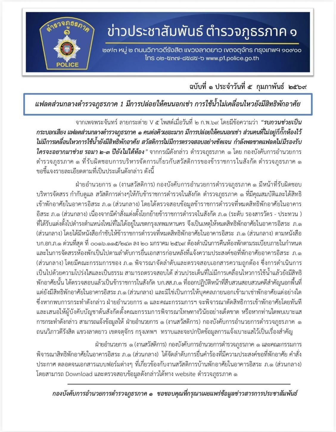 จากกรณีดังกล่าว ตำรวจภูธรภาค 1 โดย กองบังบังคับการอำนวยการตำรวจภูธรภาค 1 ที่รับผิดชอบการบริหารจัดการเกี่ยวกับสวัสดิการของข้าราชการในสังกัด ตำรวจภูรภาค 1 ขอชี้แจงรายละเอียดตามที่เป็นประเด็นดังกล่าว ดังนี้ ฝ่ายอำนวยการ 1 (งานสวัสดิการ) กองบังคับการอำนวยการตำรวจภูธรภาค 1 มีหน้าที่รับผิดชอบบริหารจัดสรร กำกับดูแล สวัสดิการต่างๆให้กับข้าราชการตำรวจในสังกัด ตำรวจภูธรภาค 1 ที่มีคุณสมบัติและได้สิทธิเข้าพักอาศัยในอาคารอิสระ ภ.1 (ส่วนกลาง) โดยได้ตรวจสอบข้อมูลข้าราชการตำรวจที่หมดสิทธิพักอาศัยในอาคารอิสระ ภ.1 (ส่วนกลาง) เนื่องจากมีคำสั่งแต่งตั้งโยกย้ายข้าราชการตำรวจในสังกัด ภ.1 (ระดับ รองสารวัตร – ประทวน) ที่ได้รับแต่งตั้งไปดำรงตำแหน่งใหม่ที่ไม่ได้อยู่ในเขตกรุงเทพมหานคร จึงเป็นเหตุให้หมดสิทธิพักอาศัยในอาคารอิสระ ภ.1 (ส่วนกลาง) โดยได้มีหนังสือกำชับให้ข้าราชการตำรวจที่หมดสิทธิพักอาศัยในอาคารอิสระ ภ.1 (ส่วนกลาง) ตามหนังสือ บก.อก.ก.1 ด่วนที่สุด ที่ 016.115/243 ลง 20 มกราคม 2569 ต้องดำเนินการคืนห้องพักตามระเบียบภายในกำหนด และในการจัดสรรห้องพักเป็นไปตามลำดับการยื่นเอกสารก่อนหลังที่แจ้งความประสงค์ขอที่พักอาศัยอาคารอิสระ ภ.1 (ส่วนกลาง) โดยมีคณะกรรมการของ ภ.1 พิจารณาจัดลำดับและตรวจสอบเอกสารความถูกต้อง ซึ่งการดำเนินการเป็นไปด้วยความโปร่งใสและเป็นธรรม สามารถตรวจสอบได้ ส่วนประเด็นที่ไม่มีการเคลื่อนไหวการใช้น้ำแล้วยังมีสิทธิพักอาศัยนั้น ได้ตรวจสอบแล้วเป็นข้าราชการในสังกัด บก.สส.ภ.1 ที่ออกปฏิบัติหน้าที่สืบสวนสอบสวนคดีสำคัญนอกพื้นที่แต่ยังมีสิทธิพักอาศัยในอาคารอิสระ ภ.1 (ส่วนกลาง) และมีใช่เป็นการให้บุคคลภายนอกเข้ามาเช่าพักอาศัยแต่อย่างใด