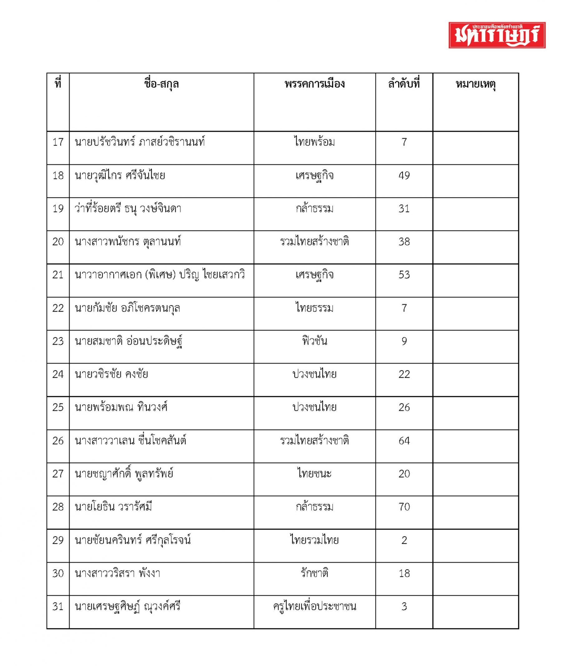 ตามที่คณะกรรมการการเลือกตั้งได้มีประกาศ เรื่อง รายชื่อผู้สมัครรับเลือกตั้งสมาชิกสภาผู้แทนราษฎรแบบบัญชีรายชื่อ นั้น