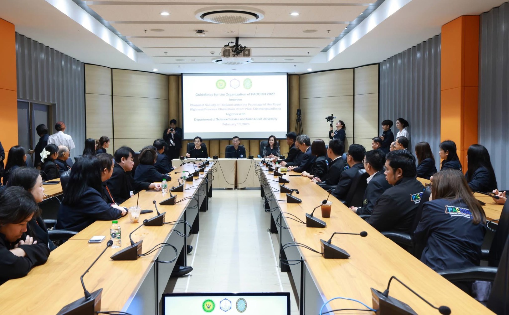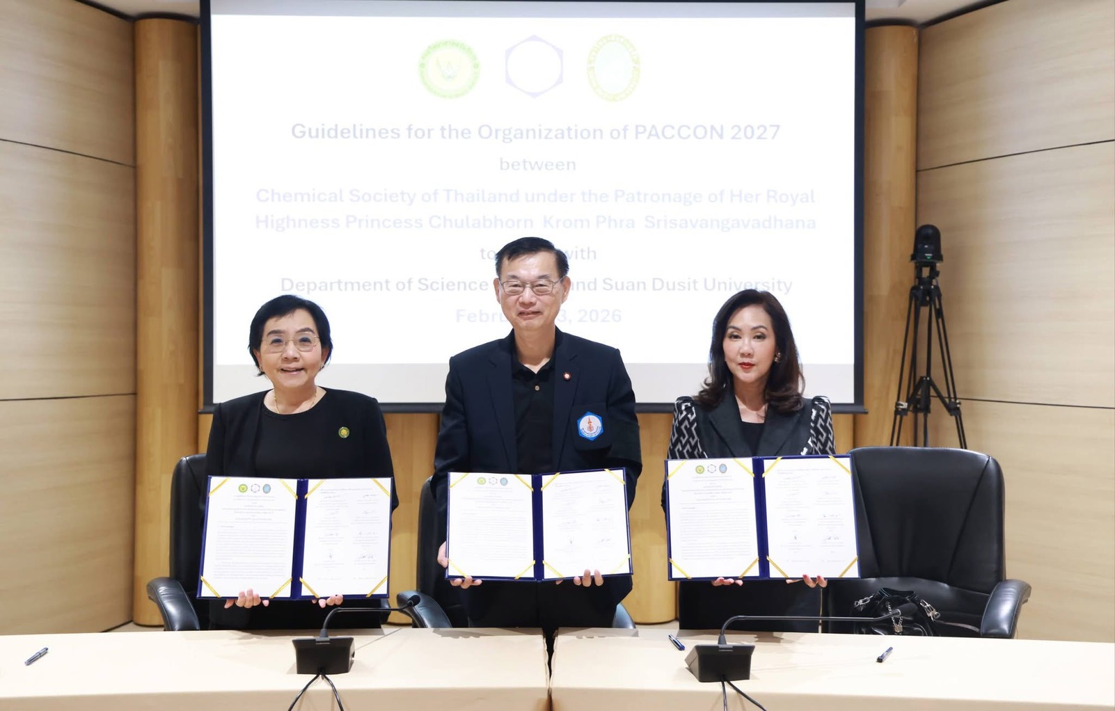 วันที่ 13 กุมภาพันธ์ 2569 ณ ศูนย์แสดงนิทรรศการและการประชุมนานาชาติสมเด็จพระนเรศวรมหาราช มหาวิทยาลัยนเรศวร โดยสมาคมเคมีแห่งประเทศไทยในพระอุปถัมภ์ ของศาสตราจารย์ ดร.สมเด็จพระเจ้าน้องนางเธอเจ้าฟ้าจุฬาภรณวลัยลักษณ์ อัครราชกุมารี กรมพระศรีสวางควัฒนวรขัตติยราชนารี ได้มอบหมายให้กรมวิทยาศาสตร์บริการ (วศ.) และมหาวิทยาลัยสวนดุสิต เป็นเจ้าภาพร่วมจัดการประชุมวิชาการนานาชาติ Pure and Applied Chemistry International Conference 2027 (PACCON 2027) ภายใต้ธีม “Chemical Innovation” Longevity and Well-being มีวัตถุประสงค์เพื่อเผยแพร่ความรู้ทั้งในส่วนของงานวิจัยพื้นฐาน งานวิจัยประยุกต์และนวัตกรรมในระดับนานาชาติ รวมถึงการสร้างเครือข่ายความร่วมมือทางวิชาการในระดับชาติและนานาชาติ กำหนดจัดขึ้นระหว่างวันที่ 11–13 กุมภาพันธ์ 2570 ณ ศูนย์ประชุมวายุภักดิ์โรงแรมเซ็นทารา ไลฟ์ แจ้งวัฒนะ กรุงเทพมหานคร