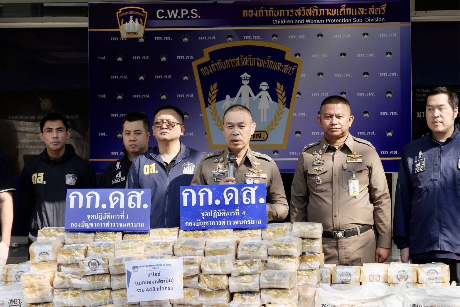 วันที่ 23 ก.พ.2569 เวลา 15.00 น. ณ กองกำกับการสวัสดิภาพเด็กและสตรี กองบัญชาการตำรวจนครบาล (กก.ดส.บช.น.) พล.ต.ท.สยาม บุญสม ผบช.น. พร้อมด้วย พล.ต.ต.ธีรเดช ธรรมสุธีร์ รอง ผบช.น., พ.ต.อ.ศภชัย ชัยสุรรณ ผกก.ดส., พ.ต.ท.ปียรัช เวสสะโกศล, พ.ต.ท.วรปรัชญ์ วุฑฒิรักษ์, พ.ต.ท.นราธิป คงเพ็ชร์ รอง ผกก.กก.ดส.บช.น., พ.ต.ท.จักรี นารีผล, พ.ต.ท.รชต พุ่มพันธุ์ม่วง สว.กก.ดส.บช.น.พร้อมเจ้าหน้าที่ตำรวจชุดปฏิบัติการที่ 1-4 กก.ดส.บช.น.ร่วมกันแถลงข่าวผลการจับกุม นายสมชาย ทองอ้วน อายุ 55 ปี ชาว จ.มหาสารคาม และ นายปรีดา โน๊ตสุภา อายุ 54 ปี ชาว จ.มุกดาหาร โดยทั้งสองมีอาชีพขับรถตู้รับจ้าง-ให้เช่า พร้อมด้วยของกลางยาเสพติดให้โทษประเภท 1 (เมทแอมเฟตามีนหรือไอซ์) จำนวน 23 กระสอบ จำนวน 448 ห่อ น้ำหนักประมาณ 448 กิโลกรัม บรรจุในกระสอบอาหารแมว, อาหารสุนัข โดยใช้รถตู้ ยี่ห้อโตโยต้า สีขาว ทะเบียน 1 นก 2114 กรุงเทพมหานคร และรถตู้ยี่ห้อ โตโยต้า สีบอร์นเงิน ทะเบียน 1 นก 4306 กรุงเทพมหานคร ที่ใช้ซุกซ่อนยาเสพติดรวม 2 คัน โดยสามารถจับกุมได้ที่บริเวณริมถนนบางแวก แขวงคลองขวาง เขตภาษีเจริญ กรุงเทพมหานคร