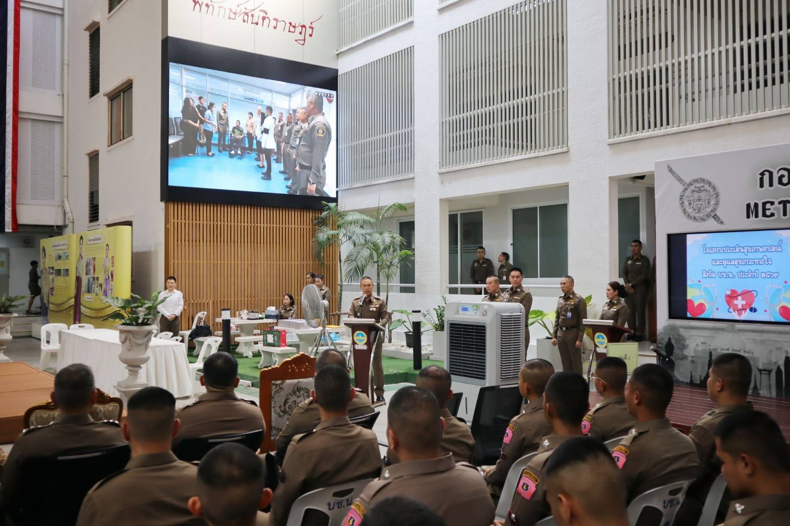 พล.ต.ท.สยามฯ กล่าวทิ้งท้าย ขอบคุณคณะแพทย์และทีมงานของโรงพยาบาลตำรวจที่กรุณาเสียสละเวลามาดูแลสุขภาพของตำรวจนครบาล ซึ่งมีภารกิจค่อนข้างหนัก ตึงทำให้เกิดความเครียดได้ อยากให้ทุกท่านสนใจและฟังคำแนะนำจากทีมแพทย์ ให้ช่วยกันดูแลสุขภาพของตัวเอง ร่วมกันขับเคลื่อนโครงการที่มีคุณค่าและเป็นประโยชน์อย่างยิ่งต่อองค์กรตำรวจขอให้ผู้เข้าร่วมโครงการทุกท่านได้รับความรู้ความเข้าใจและสามารถนำไปปรับใช้ในการดูแลตนเอง รวมถึง เพื่อนร่วมงานต่อไป