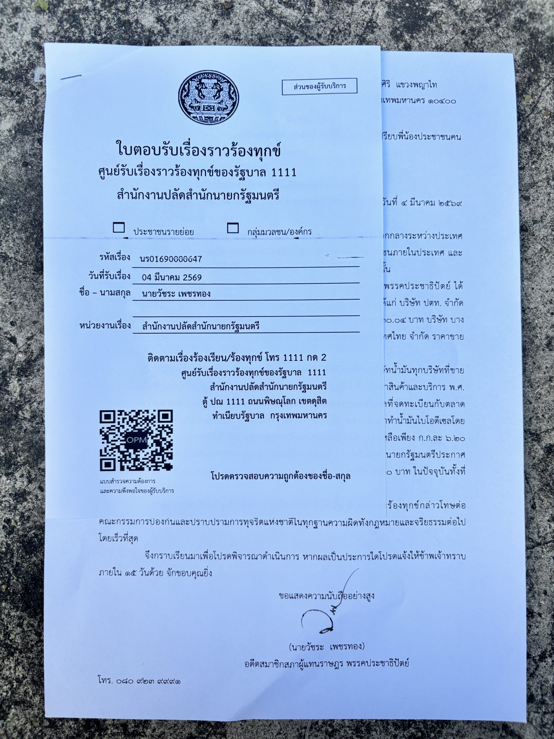 หากท่านละเว้นหรือเพิกเฉยไม่ปฏิบัติหน้าที่ทันทีนั้น ข้าพเจ้าจะร้องทุกข์กล่าวโทษต่อคณะกรรมการป้องกันและปราบปรามการทุจริตแห่งชาติในทุกฐานความผิดทั้งกฎหมายและจริยธรรมต่อไปโดยเร็วที่สุด